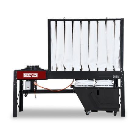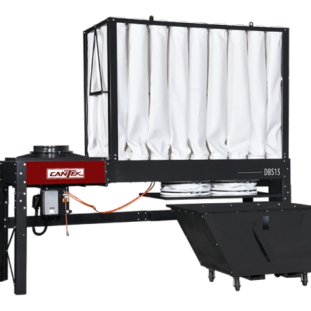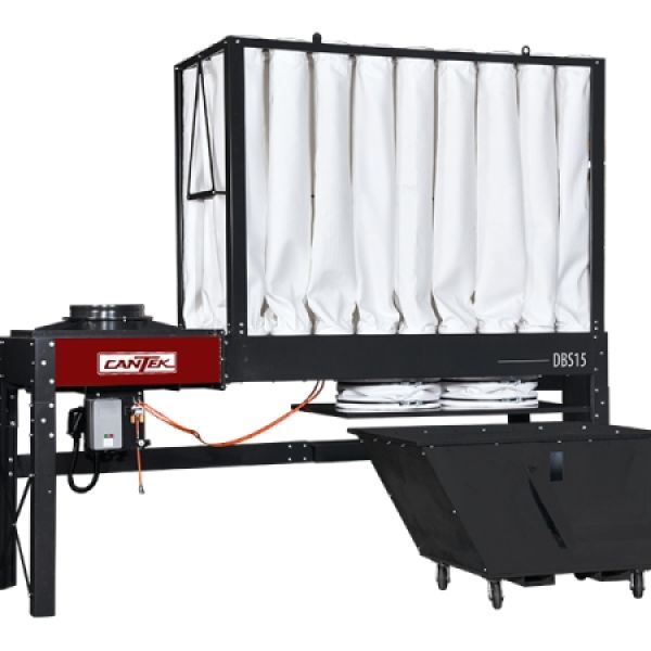 It is time to clear the air and upgrade your dust system to the next level! The Cantek DBS15 15 HP dust collector is a high efficiency indoor dust collectors generating up to 5000 CFM and are available in 10HP (DBS10) or 15HP. Equipped with a low RPM (1750 RPM) blower is designed to run much quieter than other high RPM units. The 1-micron filter bags ensure optimum air filtration and can be manually shaken to for cleaning. The large 168 gallon self dumping collection bin comes on casters and can be conveniently lifted by a fork lift and tilted to dump the wood waste in to your larger waste bin. A pneumatic lever is used to lift the sleeves connecting the system to the dump bin which saves time and effort.