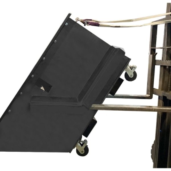 Self dumping bin allows operator to quickly, safely, and conveniently dispose of wood waste