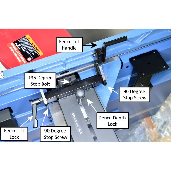 •Long solid cast iron fence features positive stops at 45° and 90°