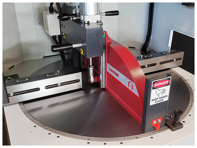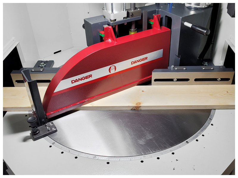 The Cantek PCM508 20” Miter Cut-Off Saw is a precision pneumatic saw designed for cutting miters up to 60° in either direction. The saw is automatically cycled pneumatically and activated by a foot switch to allow for fast positioning of the workpiece. Capable of production cutting with up to 40 cuts per minute. The cutting speed is adjustable to ensure the optimum finish result on your workpiece no matter the species or size. The rotary table runs on ball bearings to ensure effortless rotation of the blade according to the desired cutting angle. The workpiece is clamped pneumatically, and the clamping guard runs on linear guideways for smooth and fast clamping operation. The PCM508 is available with optional infeed and outfeed conveyor systems with manual stops or can be fitted with an automatic stop system such as Tigerstop for added productivity.