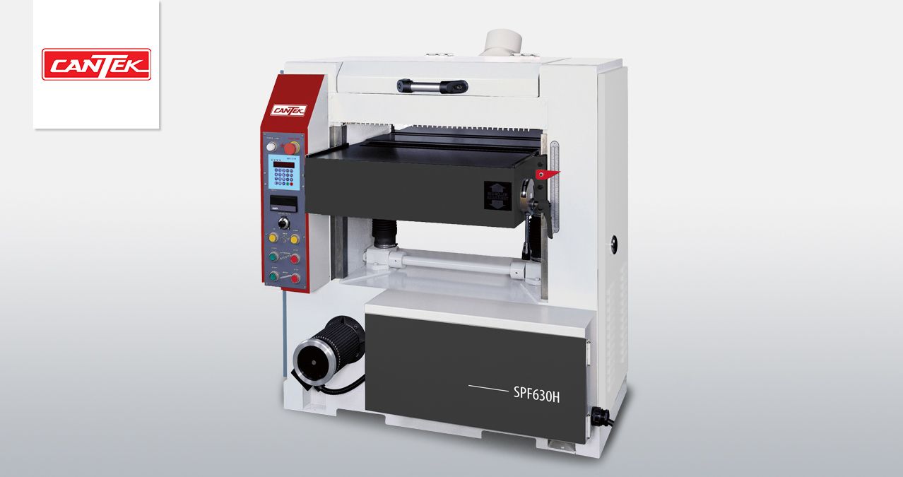 The Cantek SPF630H 24″ Planer has a solid steel helical cutterhead with 4-sided carbide knife inserts that require no adjustments when changing. Setting the table height is quick, accurate, and easy with a digital readout and simple PC controller. The frame is made from heavy cast iron with known vibration damping resulting in a longer bearing life and superior cut quality. The planer’s segmented, serrated infeed roll & segmented pressure shoe ensures material is held firmly during the feeding and planing process. The industry standard 15×15×2.5mm carbide insert knives are easily changed using a torque wrench and do not require any special tools to set the height. The insert knives are in a spiral pattern which produce a shearing action allowing for superior stock remove, resulting in a smooth planed surface, creating less noise, and requiring less power which translates in to less wear and tear on the machine.