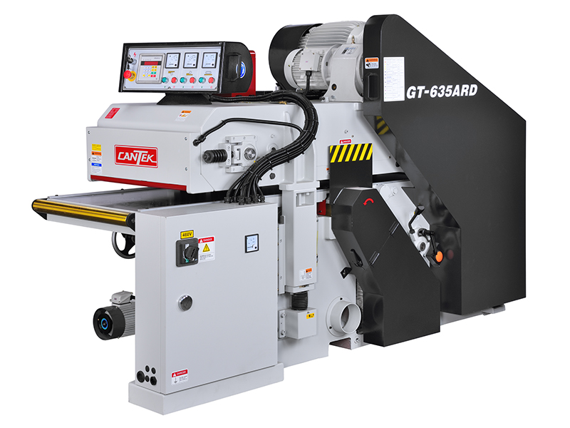Plane your material efficiently in a single pass. The Cantek GT635ARD 25″ double surface planer has a robust cast-iron body for industrial planing day in and day out. The spiral insert knife cutterheads produce a smooth planed finish with maximum stock removal. The material is passed over the bottom head with a spring-loaded pin feed system allowing it to act like a jointer to flatten the board prior to being planed to an accurate thickness with the top head.