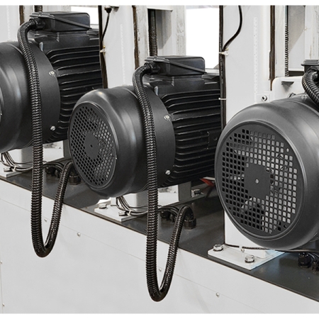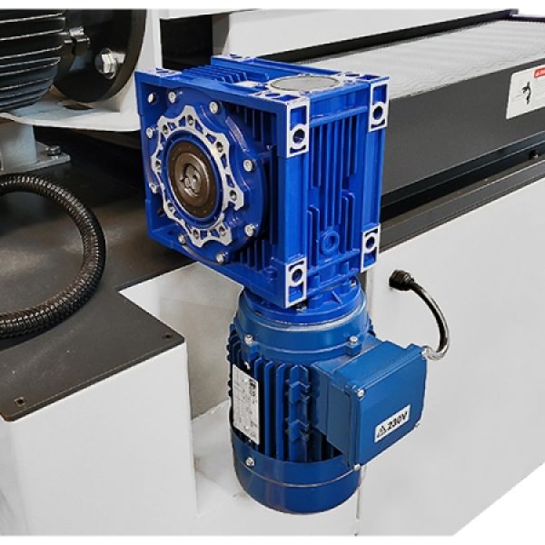 The rubber conveyor belt ensures the material is fed through the brushing heads consistently. The belt speed is controlled by a variable frequency drive. The belt is equipped with an auto tracking cylinder to ensure it does not over track to one side which prevents it from being damaged.Feed Motor