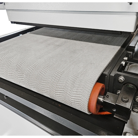 Spring loaded rubber hold down rollers before and after each brushing unit ensures material is held firmly on to the conveyor belt during brushing operations.Conveyor Belt