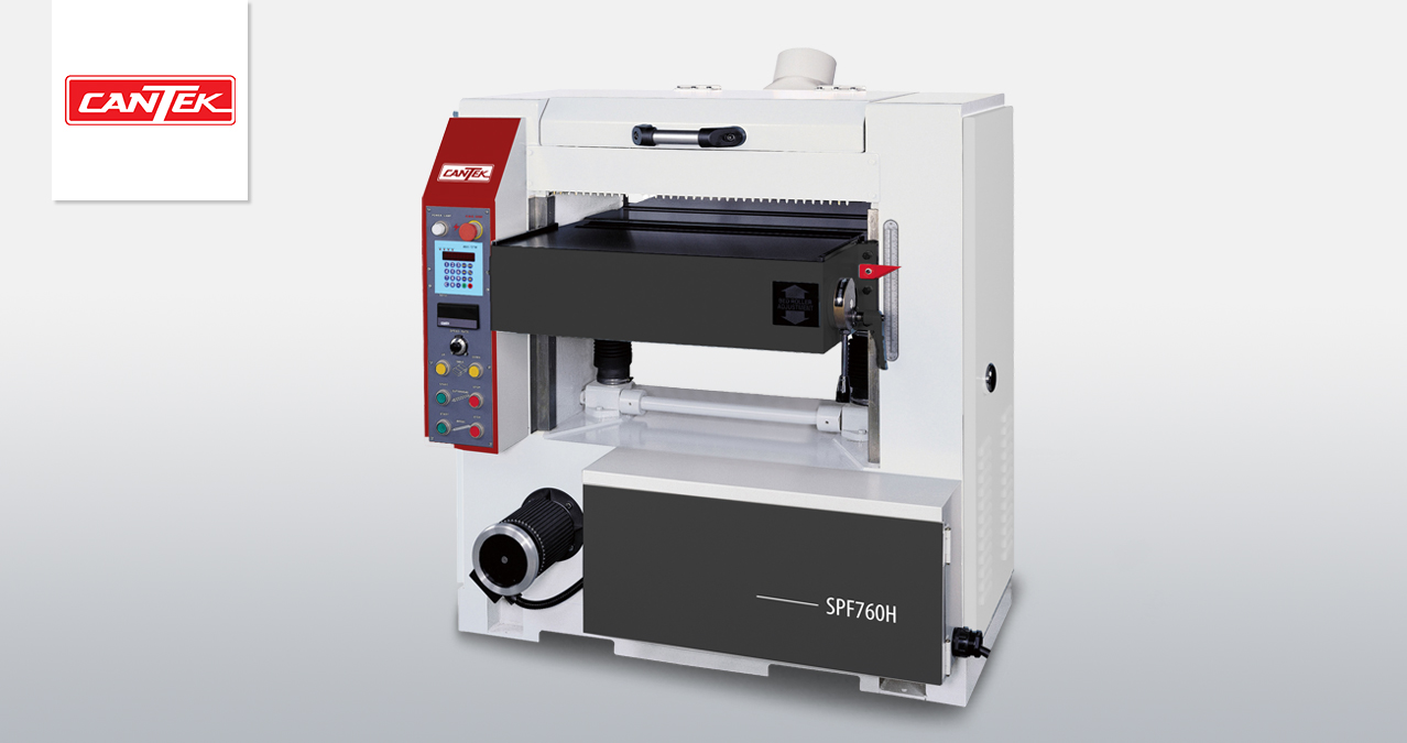 The Cantek SPF760H 30″ Planer has a solid steel helical cutterhead with 4-sided carbide knife inserts that require no adjustments when changing. Setting the table height is quick, accurate, and easy with a digital readout and simple PC controller. The frame is made from heavy cast iron with known vibration damping resulting in a longer bearing life and superior cut quality. The planer’s segmented, serrated infeed roll & segmented pressure shoe ensures material is held firmly during the feeding and planing process. The industry standard 15×15×2.5mm carbide insert knives are easily changed using a torque wrench and do not require any special tools to set the height. The insert knives are in a spiral pattern which produce a shearing action allowing for superior stock remove, resulting in a smooth planed surface, creating less noise, and requiring less power which translates in to less wear and tear on the machine.