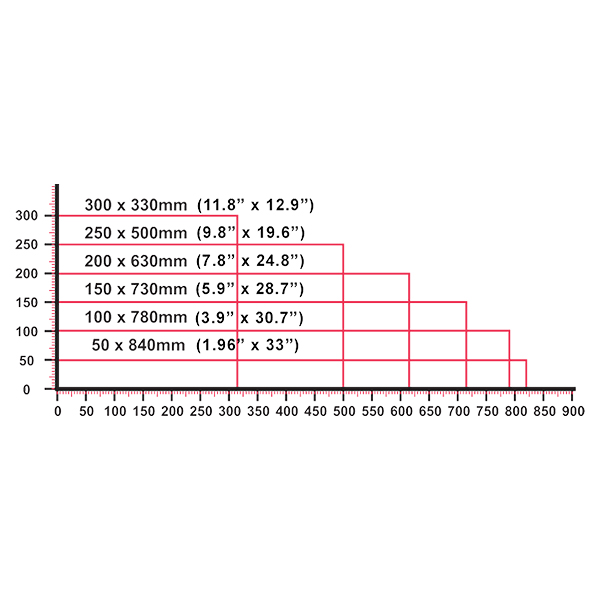 Cutting capacity (thickness x width)|2″x33″, 4″x31″, 6″x29″, 8”x25”, 10”x20”, 12”x12”