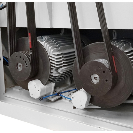 Pneumatic belt tensioning with quick-release outboard support to facilitate fast belt changes.