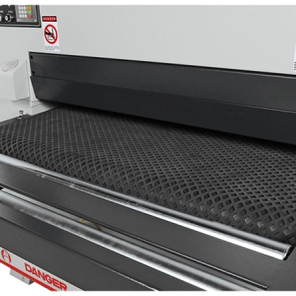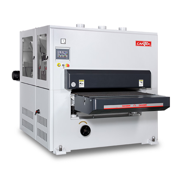 The Cantek SR43DDA 43″ three head widebelt sander combines a solid machine frame with unparalleled machine features resulting in superior sanding quality and reliability. The three sanding heads result in fewer passes through the sander resulting in increased efficiency and throughput. The first sanding head is a robust steel contact drum with calibration capacities and durability. The second head consists of a versatile rubber contact drum. The third head is a combination head with a rubber contact drum and adjustable sanding platen to perform further calibration or finish sanding with finer sanding grits. The 75″ long belts allow for longer runs between belt changes. The quick setting digital thickness control allows for accurate, automatic table adjustment for precise sanding results.
