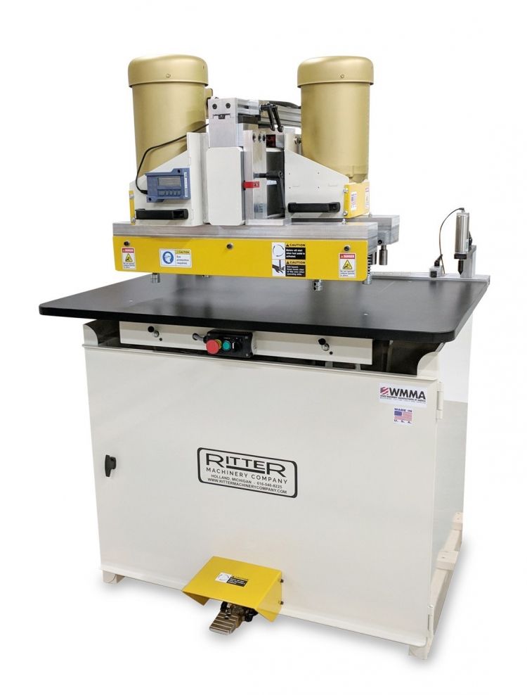 panels requiring more than two rows of system holes for hardware functions. The fixed position top drilling heads provide rigid panel control for precise hardware system hole location. Single point panel referencing fence accurately locates all hardware system