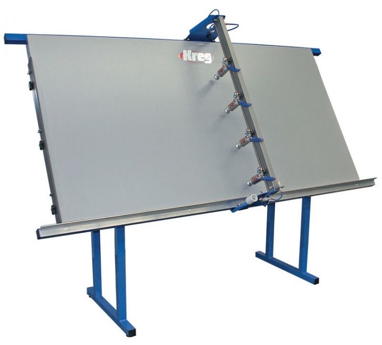 Fast face-frame assembly is great. Fast and accurate assembly that virtually eliminates sanding is even better. The Face-Framing Table has four clamping cylinders that can be precisely adjusted, applying great pressure to the joint line on almost any size of frame. The table itself stands at a 30-degree angle, so it uses less floor space than a flat table. It also prevents back pain by allowing you to stand upright, rather than hunched over. The KFT4X8 features an aluminum squaring fence on the left side of the table retracts out of the way to accommodate frames longer than 8′. Just begin your frame with the squaring fence up, then retract the fence as needed. Each clamping cylinder can be independently controlled, so you can actuate each cylinder individually or activate them all at once with a master switch located at the bottom of the clamping arm. The four high-quality clamping cylinders apply tremendous pressure on the joint line to maintain a flush assembly. The clamping arm rolls easily on roller bearings and each cylinder glides smoothly along the arm for perfect positioning.