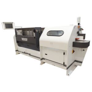 The Voorwood A5615 Automatic Double-Side Cope & Stick Shaper will process stiles and rails without operator input. RAIL PROCESSING: Substrates are hopper-fed random length parts. The machine automatically measures the rail substrate and selects the desired finished length without any operator input or downloaded cut list. The rail is placed in the dual timed cartridges with self-locating backer blocks that eliminate blowout for cope shaping, processes both cope cuts at the same time, and ensures a square part sized to the desired length. The rail is placed on a conveyor in the back of the machine after the cope shaping process and redirected 90 degrees. The power feeder aligns part into next stage to stick cut the rail, size to width, and automatically insert space balls.