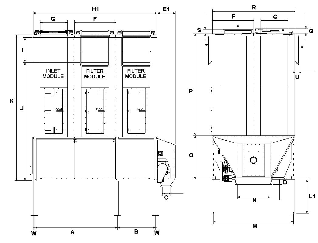 The filter hopper and inlet section (optional) separates medium-sized/large particles and distributes the air to the filter bags. A double chain conveyor on the bottom of the hopper passes the collected material to a rotary valve for discharge.