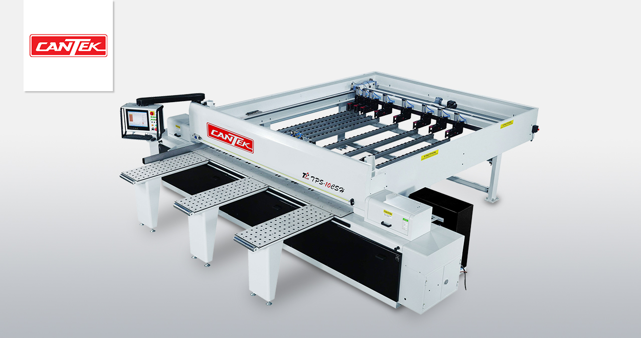 The Cantek TPS-SH Series Beam Panel Saws are a production panel sizing solution for the small to mid-sized manufacturer. The industrial machine design combined with user friendly PC control interface ensure accurately dimensions sheet components with a chip free finish. Available in 8’, 10’, 12’ with front loading. The powerful 18HP saw motor and carriage runs on two round hardened guide rails on (8) copper wheels. The saw carriage cutting speed is variably adjusted according to your cutting height requirement. A double side aligner ensures panels are squarely cut during crosscutting operations. The onboard PC control allows the operator to program right at the machine or import a cutting list which can be run though the standard optimization software.
