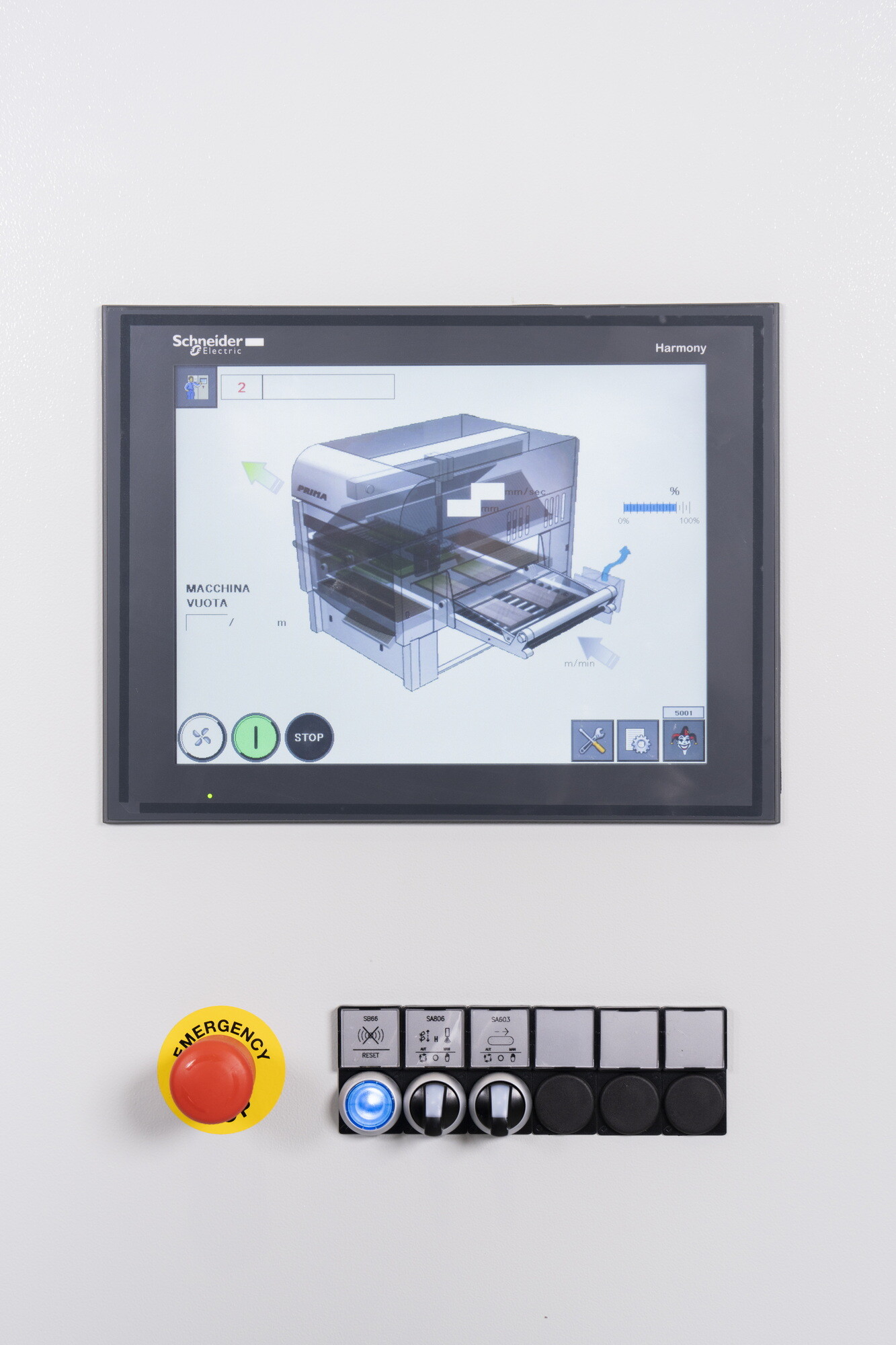 – Electric control panel with PLC and machine control software, managed by a wide, colour touchscreen control panel.