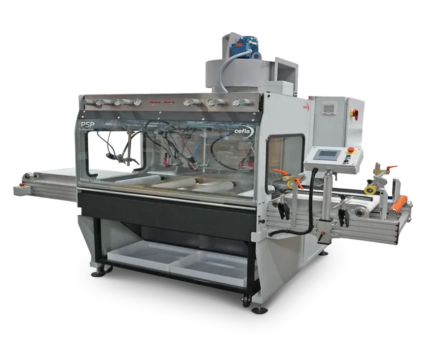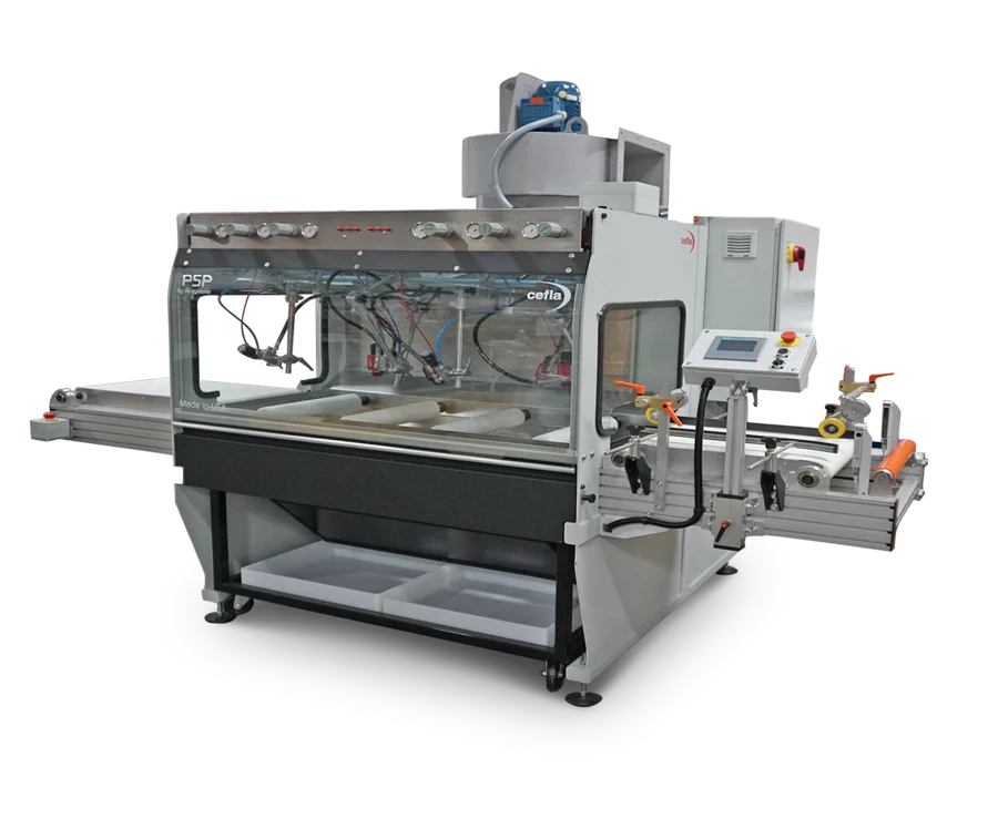 The PSP6, ideal for flooring and other lineal profiles, enhances productivity by combining high quality and efficiency while providing a low environmental impact. Compatible with water-based and solvent-based applications. Stainless steel construction is easy to clean. Multiple filters provide optimal airflow that minimize coating overspray. Reading barrier scans parts as they enter spray cavity to provide an accurate quantity of coating material to each part. The machine can easily be integrated with profile stacking, material handling, lateral/cross transfer equipment to simplify operations procedures. Adjustable infeed guides ensure parts are correctly fed into the spray cavity. The infeed/outfeed belts feature rollers with a protective sleeve inside the spray booth. Multiple infeed and outfeed belt options available. Large viewing window helps operator see spray application in real time. The drive system combines a 30-150 fpm conveyor with inverter-controlled conveyor speed and an ATEX-rated conveyor drive motor.