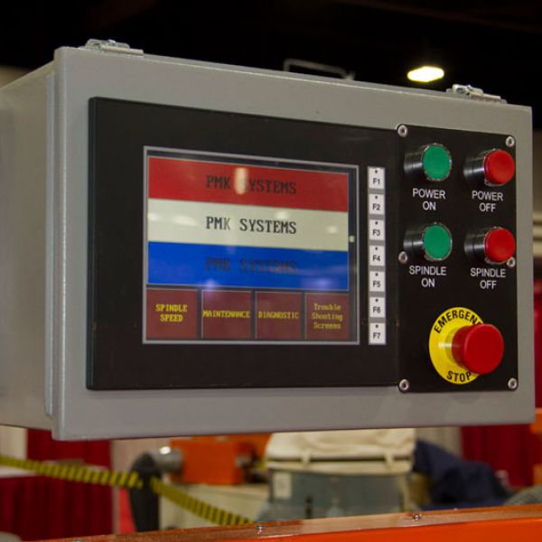 •PMK Custom C-1205 HSK/PLC features quick change spindles with 8″ touch screen monitor