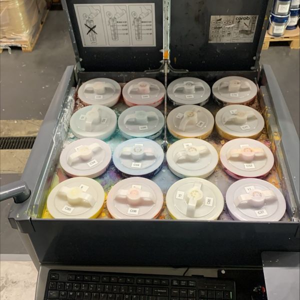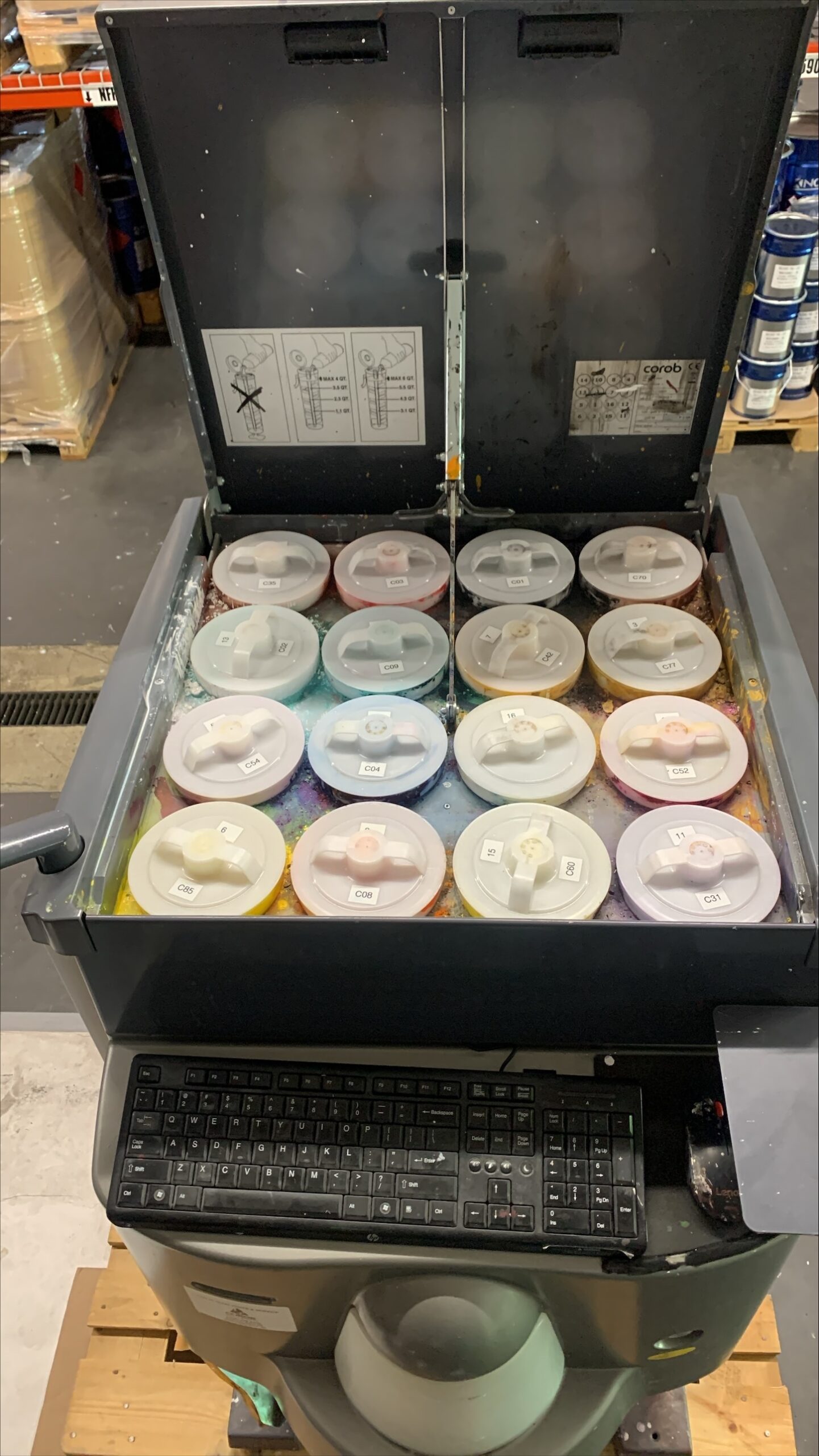 Corob D300 Paint Colorant Dispenser. Piston pump style. Setup for water-based colorants. Has 16 Canisters.