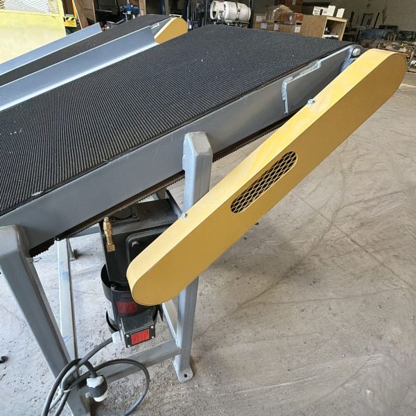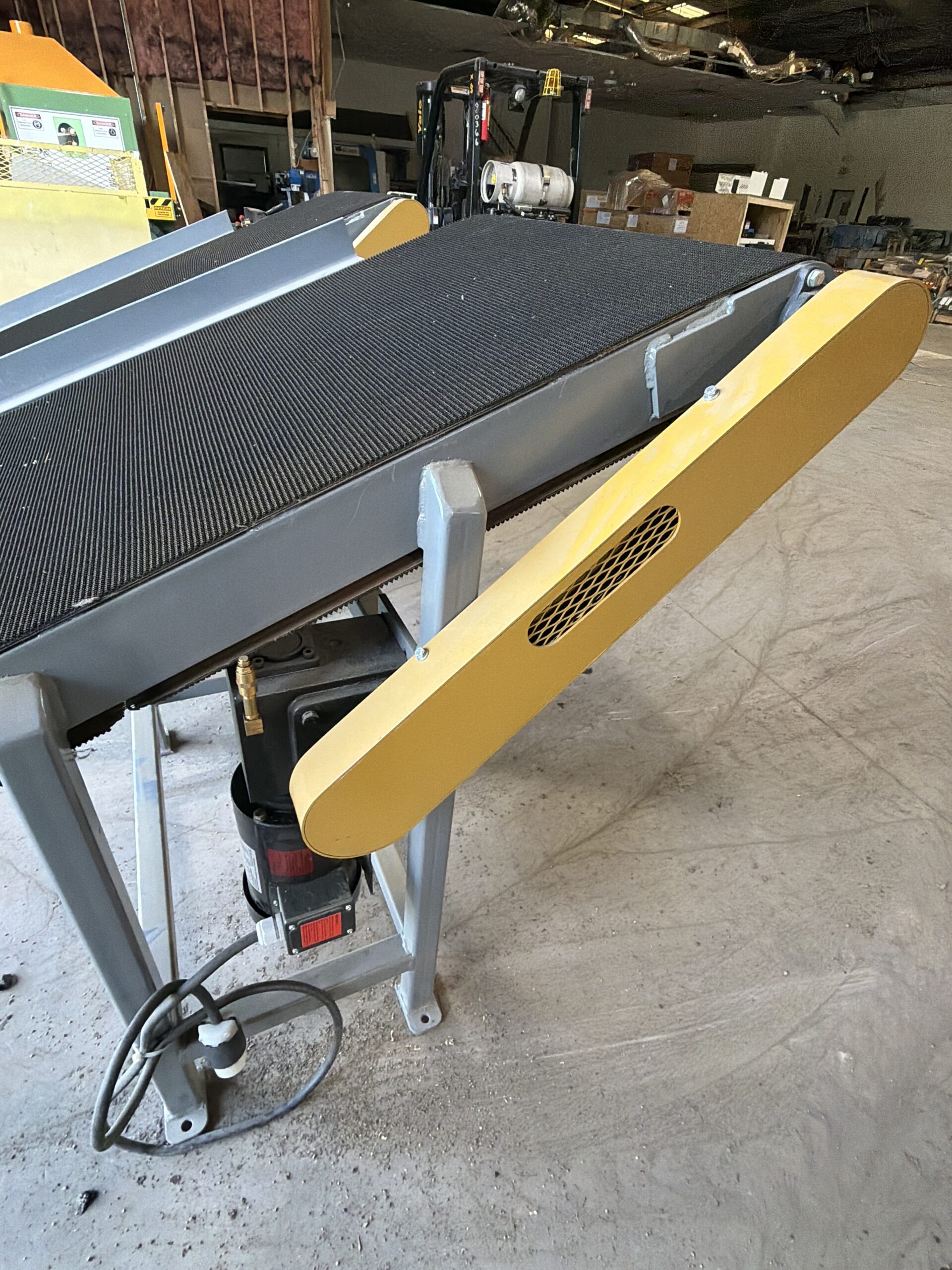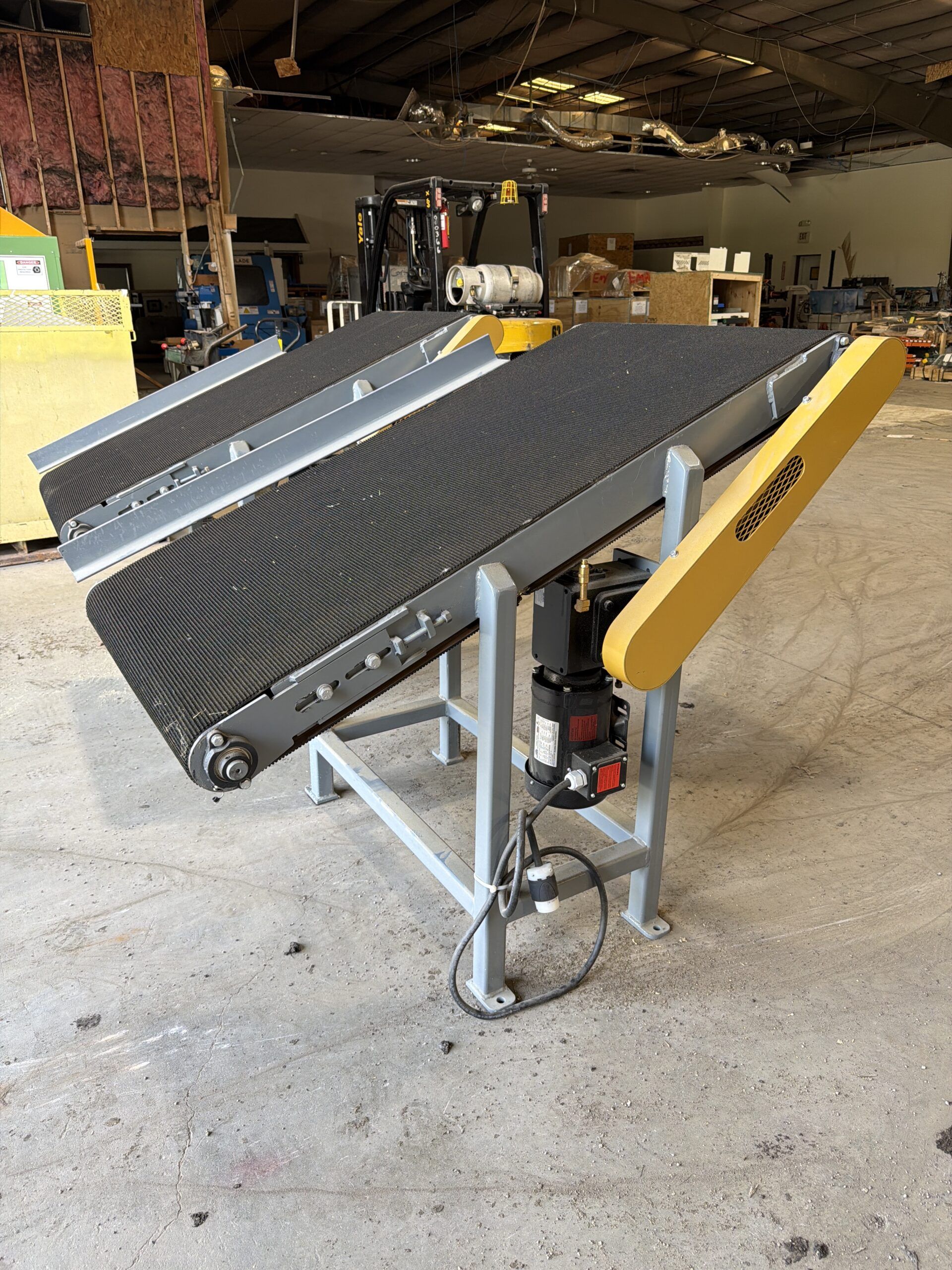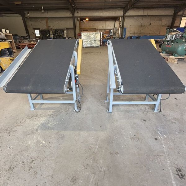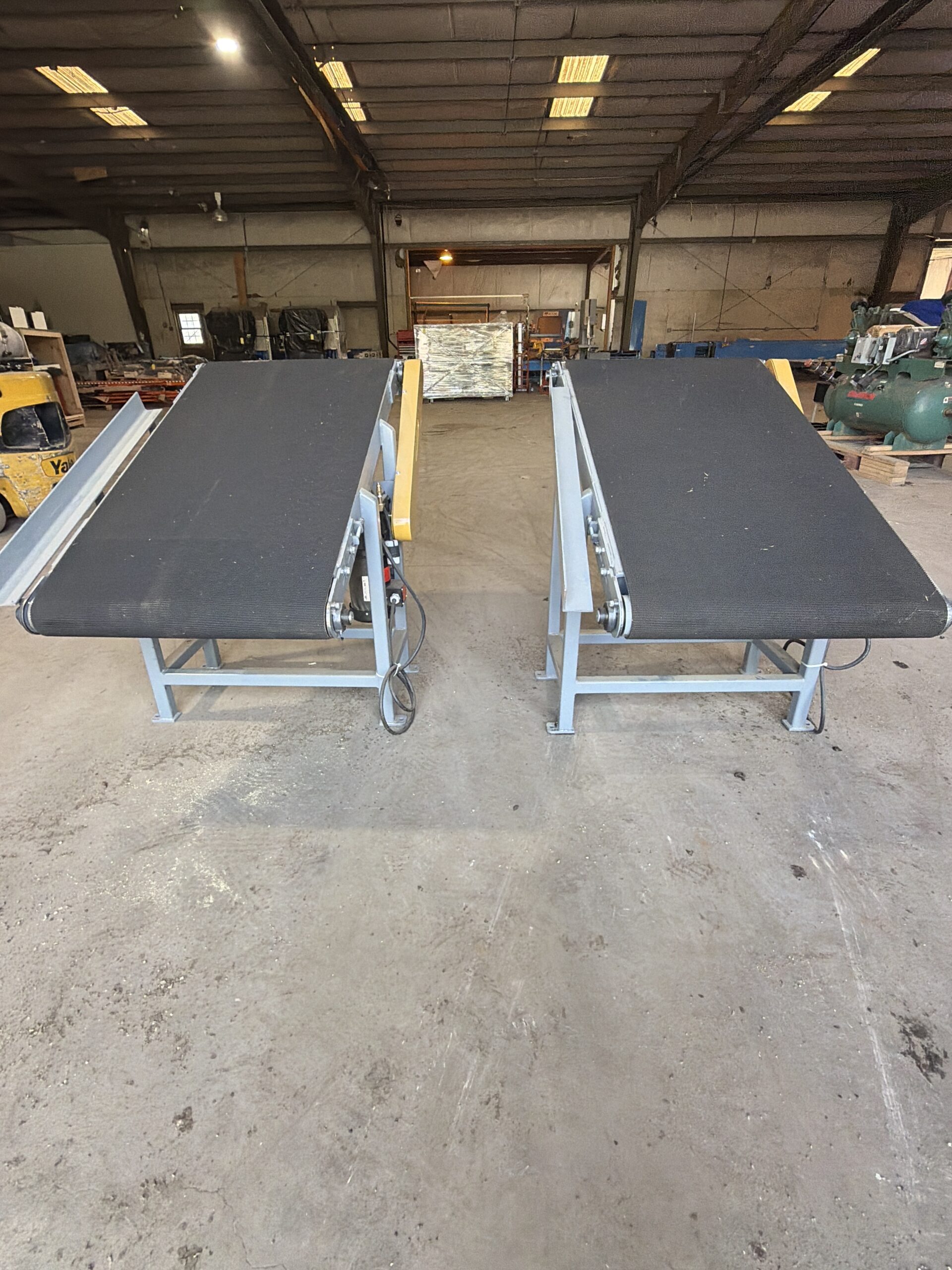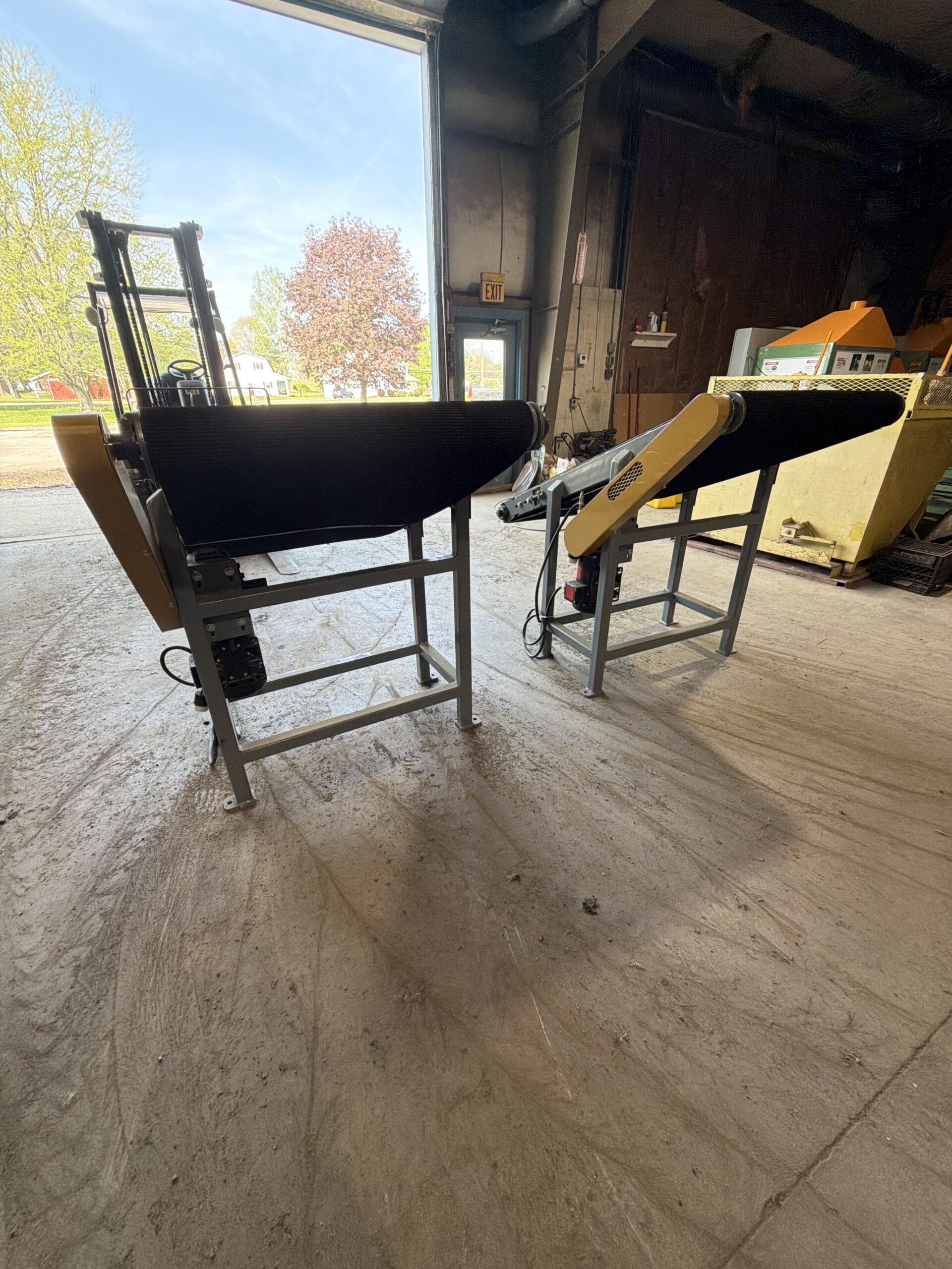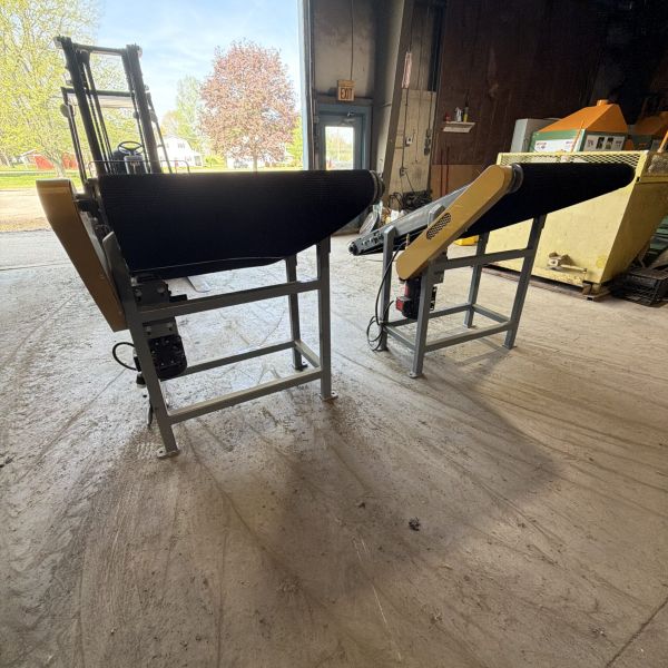 Custom Hershey Machine belt conveyors, made for kicker stations off a chop saw outfeed system. Belt surface is 31 1/2” wide 60” long, low end belt is 29” from floor, high end belt is 50”. Two conveyors sell together.