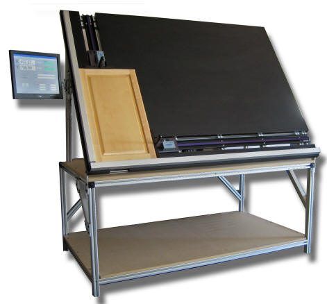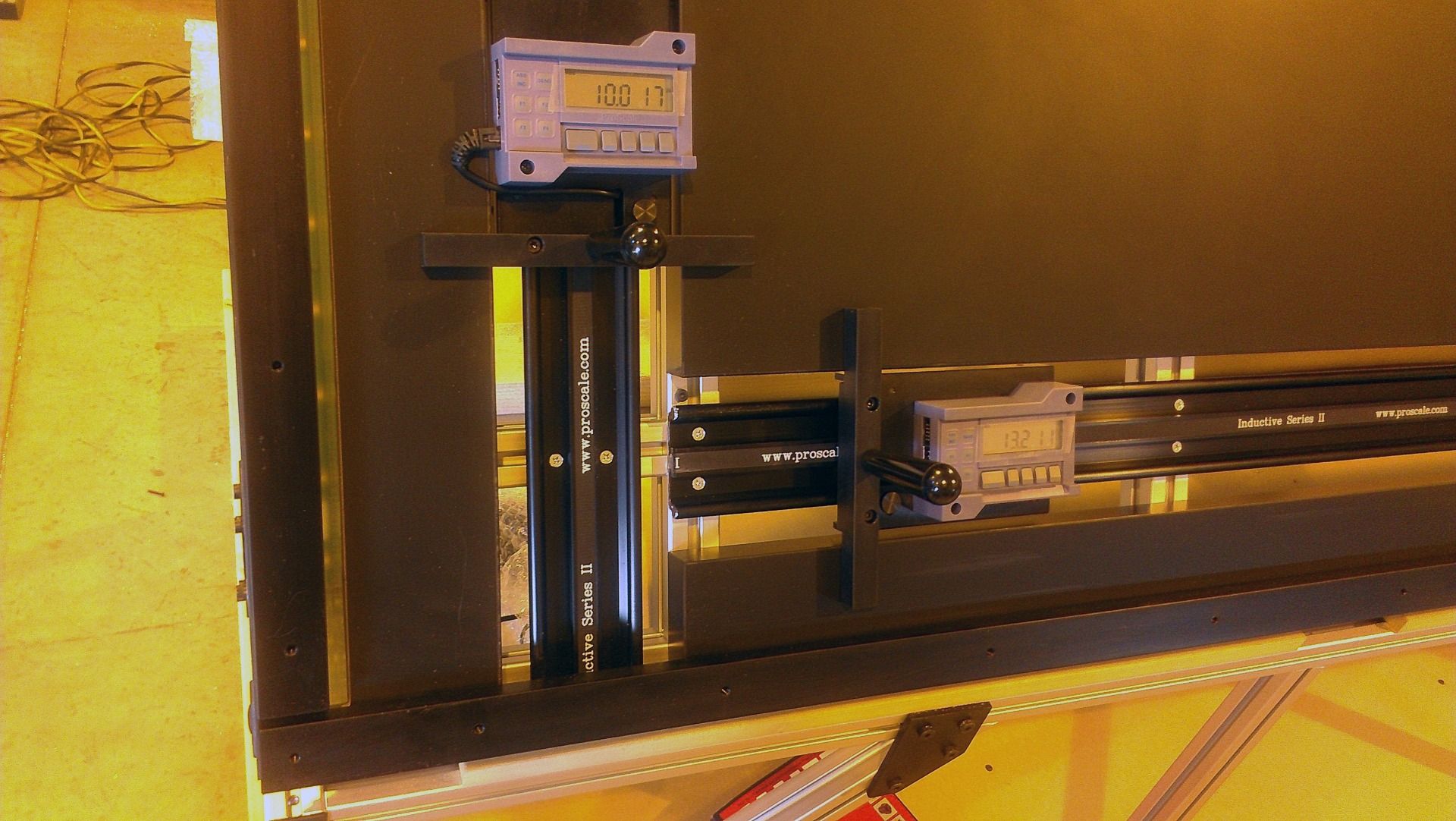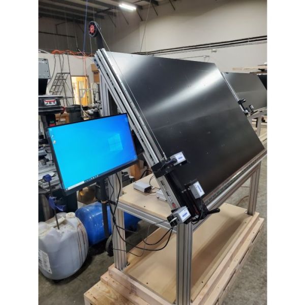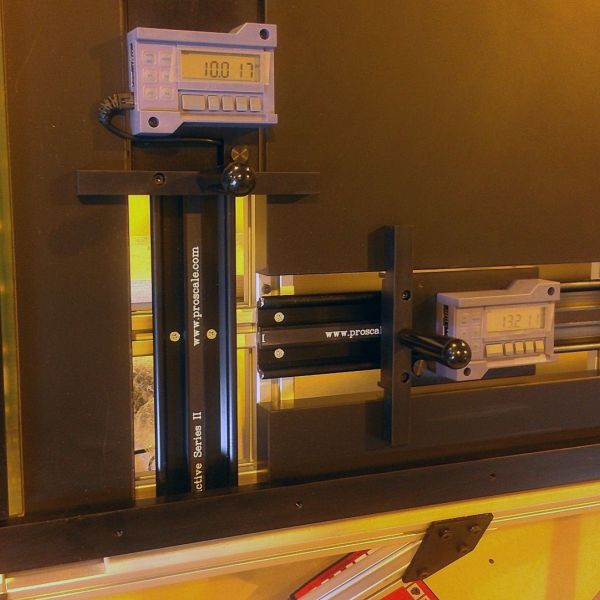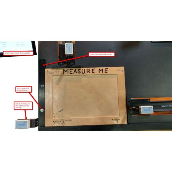 ProTable-CAB is a two axis measuring system designed for quick and affordable length and width measurements of non-ferrous products such as glass, wood, ceiling tiles and other like products. Several standard configuration exist that offer size choices and optional computer/software choices. The standard ProTable-CAB system is made with a 40 inch (vertical) x 60 inch (horizontal) measuring range. The moving carriages are built with battery powered digital readouts. With this system, an operator places a part onto the horizontal fence, then against the vertical fence. They read the dimensions on the digital readouts and compare the values for width and height to a ‘runner document’ or a production sheet. The operator then decides if the part measured is good or bad.