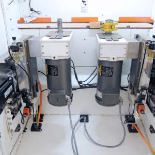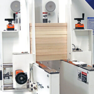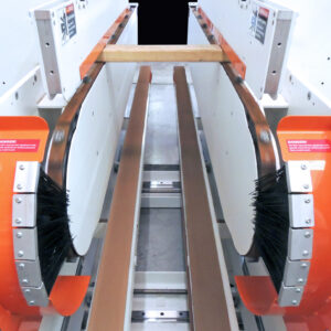 The A215 Double-Side Cope Shaper is equipped with mirrored shaping stations on either side. The first station has the option to be configured to jump in or out during the cut and includes automatic CNC control of the horizontal axis for the best possible repeatability. Servo positioning is accurate within.002”. The second unit rotates against the direction of feed to finish the cut started by the first shaper. This Double-End Cope Tenoner has variable-speed transporter drive motors that are electronically synchronized. The A215 Double-Side Cope Shaper profiles BOTH edges of MDF and hardwood parts in ONE continuous pass. With the movable side adjustable for width, the transporter assemblies incorporate an infeed support area that has a gravity-fed hopper system. Bottom-feed chains with pop-up lugs on 4” centers to grab and pull the substrate from the bottom of the hopper into the frame cabinet and past the shaping stations. Two optional automatic space ball insertion assemblies can be attached to the hopper feed system to automatically insert balls into the board. The A215 Double-Side Cope Shaper has inserting nozzles that are positioned directly above the feed chain to insert space balls into the rail groove approximately 5/8” away from the cope cut.