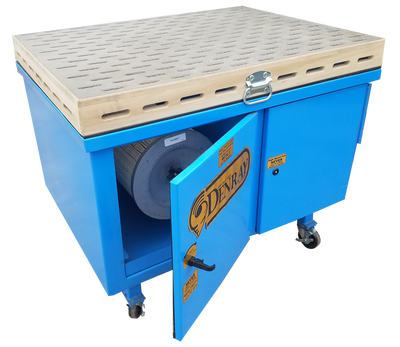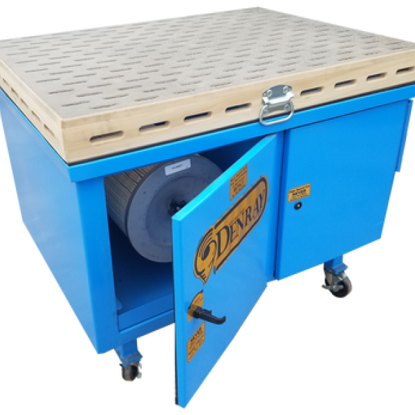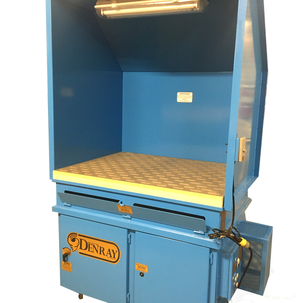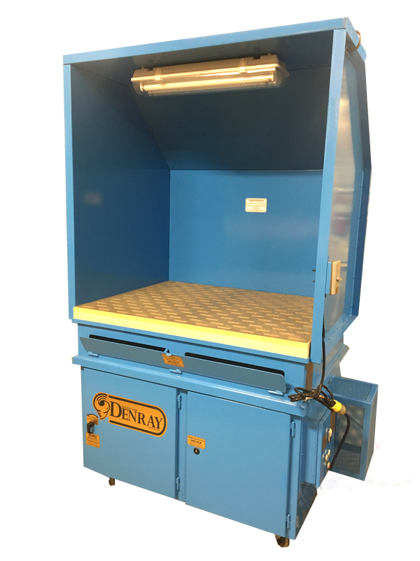 This model is similar to the 3444B, but contains a larger fan and motor, along with our typical rails and tops found on our larger tables. There are no intake dust ports or vise due to these modifications. The 3444B Super comes with 80/20 cartridge filters which clean with a 99.95% capture rate at .5 micron. This model comes standard with casters, Denray’s “Jet Pulse” push button cleaning, and a rubber coated top. This model does provide the option of a tilt out front edge as an add-on.