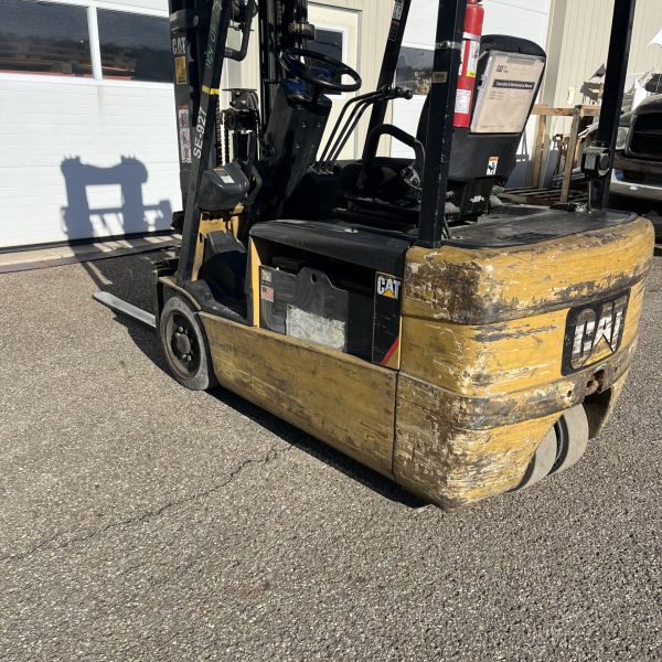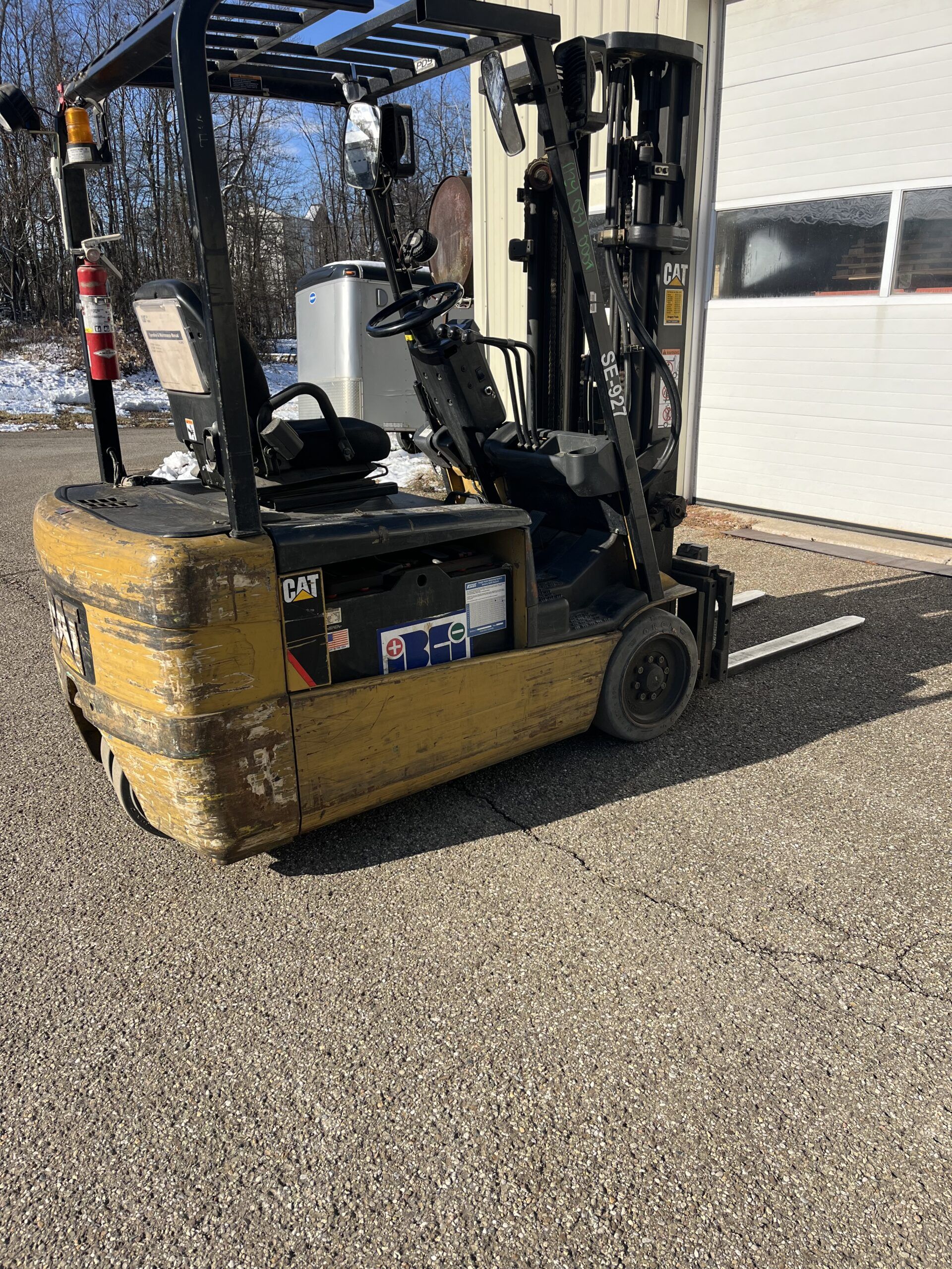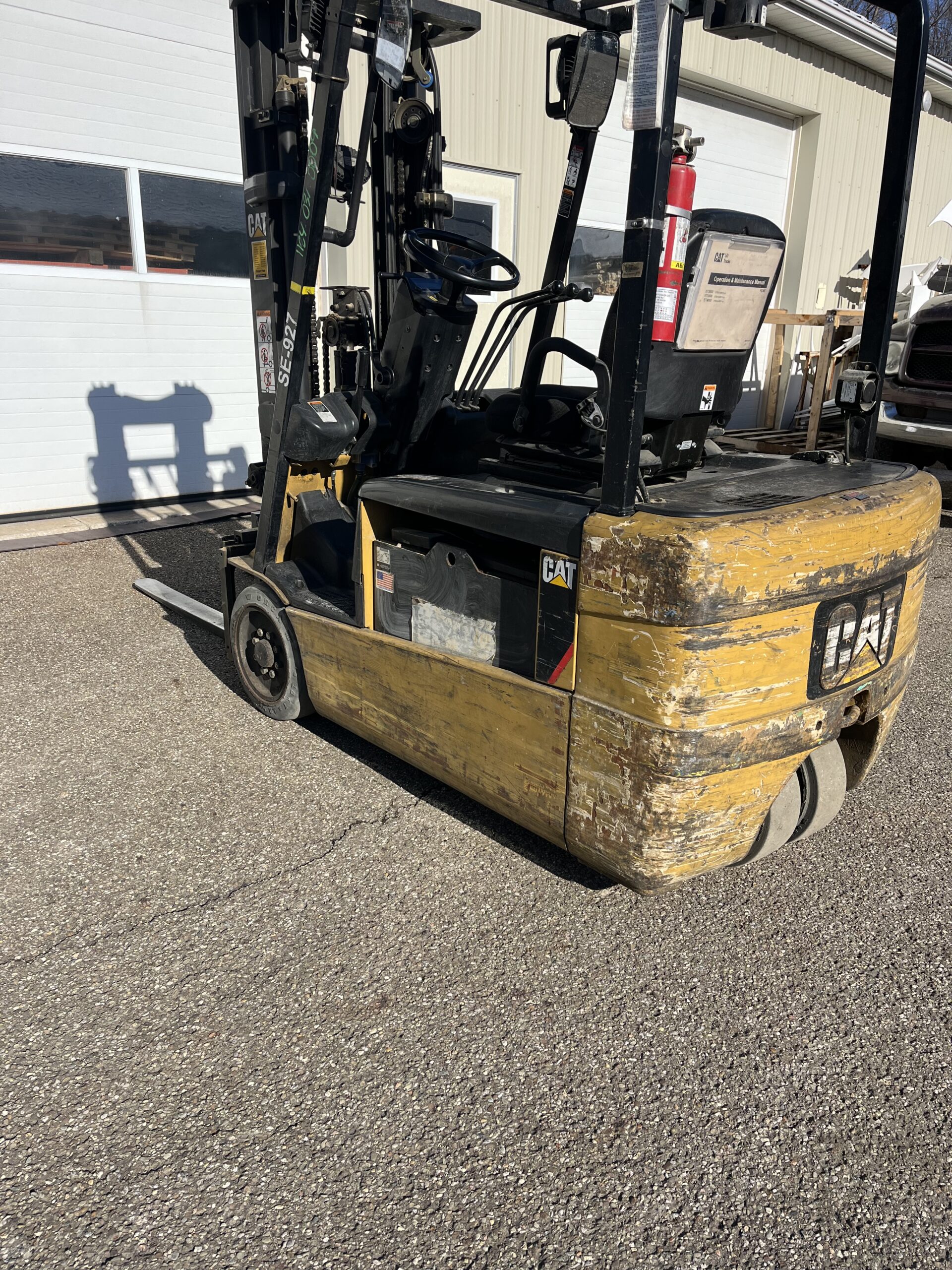 Cat Forklift 36 Volt Battery 3 stage mast 188in lift height 42 in forks dual Hrs 9266 rear center wheels allow for tight radius turning in tight spaces charger also available for 200.00 charger is 3 phase 230 volt input with 36 volt output