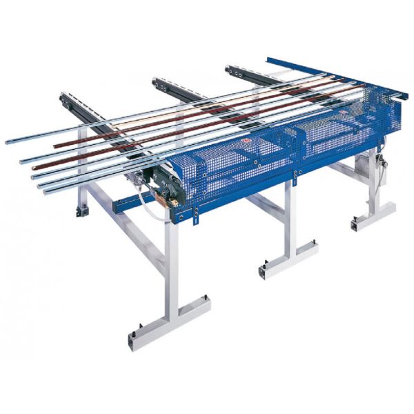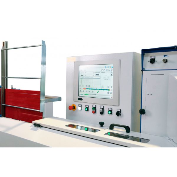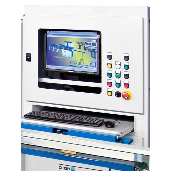 Fully Automatic CNC Mitering System with fixed blade angle. 14″ saw blades. Complete with hopper feeder is ideal for high production situations in the photo frame, windows, door and kitchen cabinet components. The V 235 NC has been designed on the same concepts of the V 2013 NC by streamlining the project and making it even more cost effective. The system is well suited for elevated production of picture and photo frames as well as any other component which is assembled by way of mitering the ends. Sophisticated, but simple and practical, the system is fitted with a guidance computer which makes the machine more productive and flexible, for an improved quality of the finished product. The machine counts with a hopper feeder (available in both Horizontal and Vertical versions) which allows it to function completely unattended. The following are some of the key features of the V 235 NC Fully Automated Mitering System: Optimized Cutting By inputting the data relating to the length of the moulding along with the cutting list, the machine is able to select the best sequence automatically, maximizing the material’s yield. Higher Production The high speed feed carriage allows large scale production in any circumstance. The zero setup time for changes in the cutting list, is another important factor in the high performance of this unique system. Depending on several variables the output of the system ranges from 1000 to 1500 pieces per hour. Data Storage The computer has down loading capability through the 3 1/2″ floppy disk or direct cable connection via RS 232 port. It is possible to interrupt the cutting process at any time and have a different program carried out, while all the data relating to the first program including the number of pieces still to be executed remain stored. Easy User Interface The onboard PC with its 19″ monitor, allows all the messages that the operator requires, to be fully and constantly displayed in the desired language. A step by step full graphic display makes it easy for the operator to select the required operation. The on the screen diagnosis , reduces needless down time due to electric or pneumatic failure. Flexibility The two 14″ saw blades make it possible to attain a considerable cutting capacity.