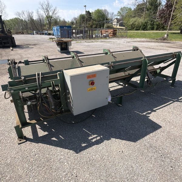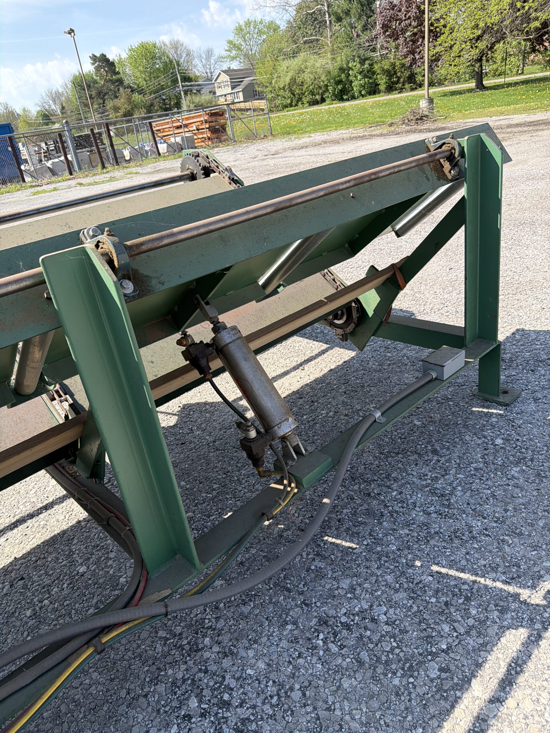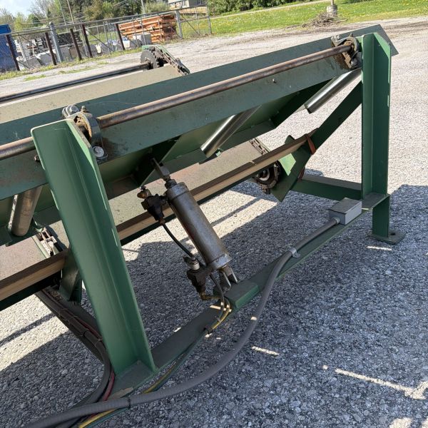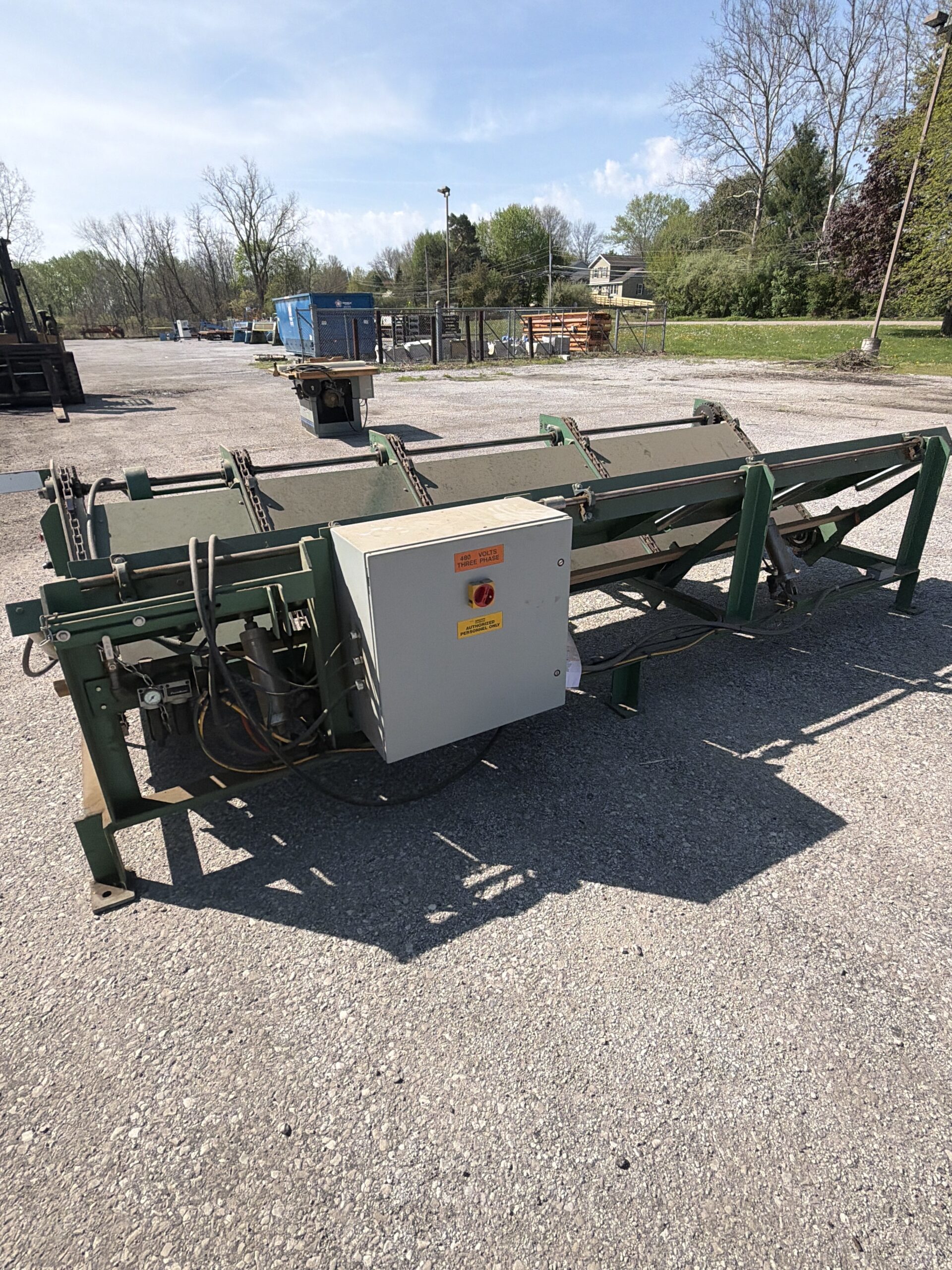 The roller deck raises up when the ripped boards are coming out of the handgrip saw, once the board passes a sensor it will drop the boards and allow the incline chain to pull them up and move them to a green chain. Electrical work required to function with a gangrip saw. 13’ long, 6’ wide. Roller deck is 34” from floor when raised up, chain is 36” from floor.