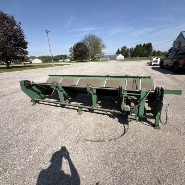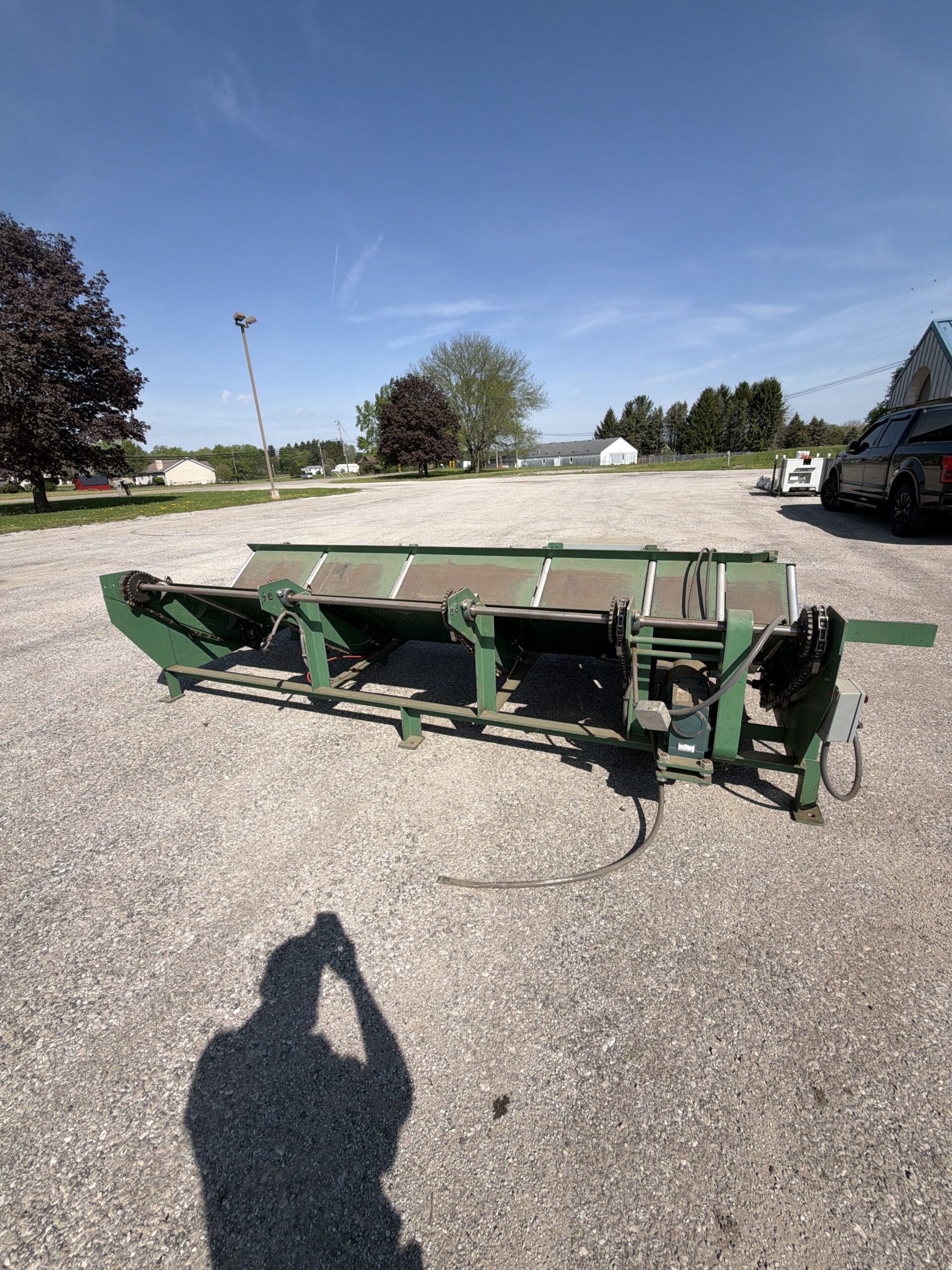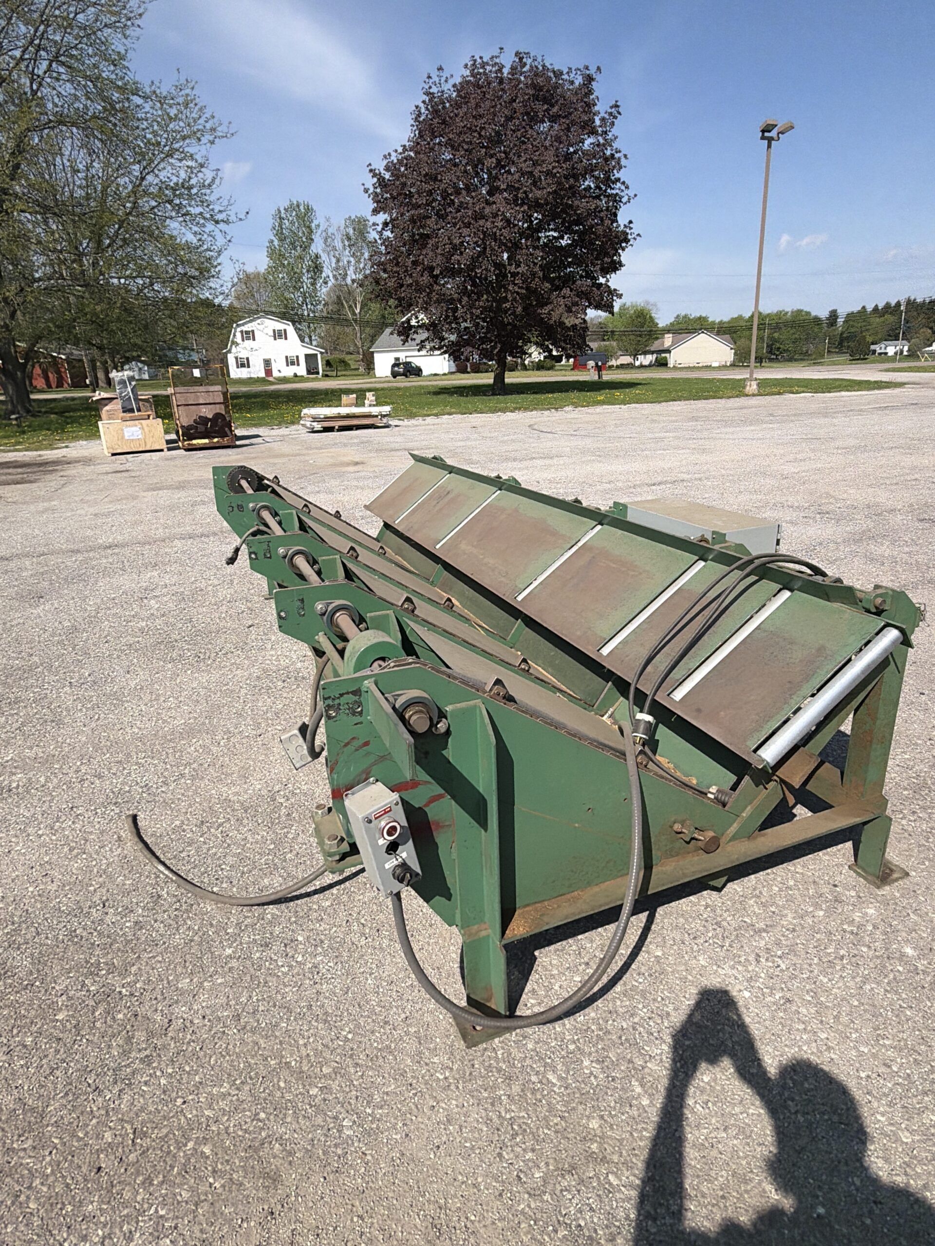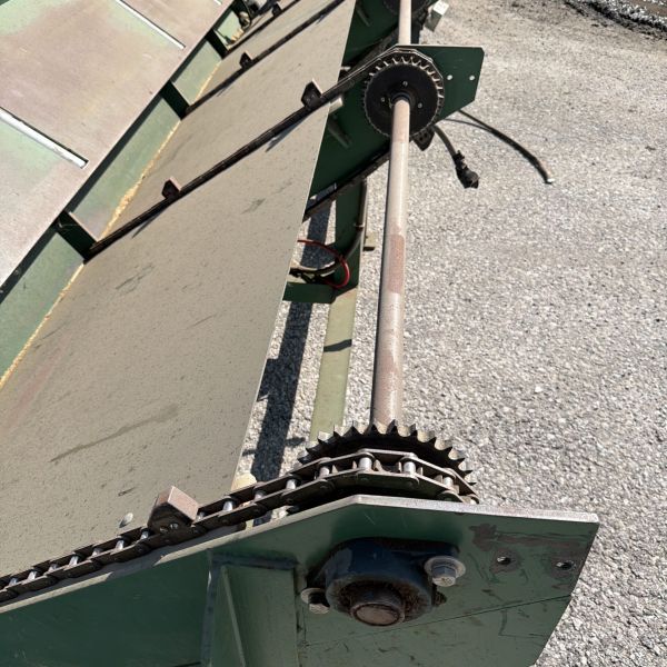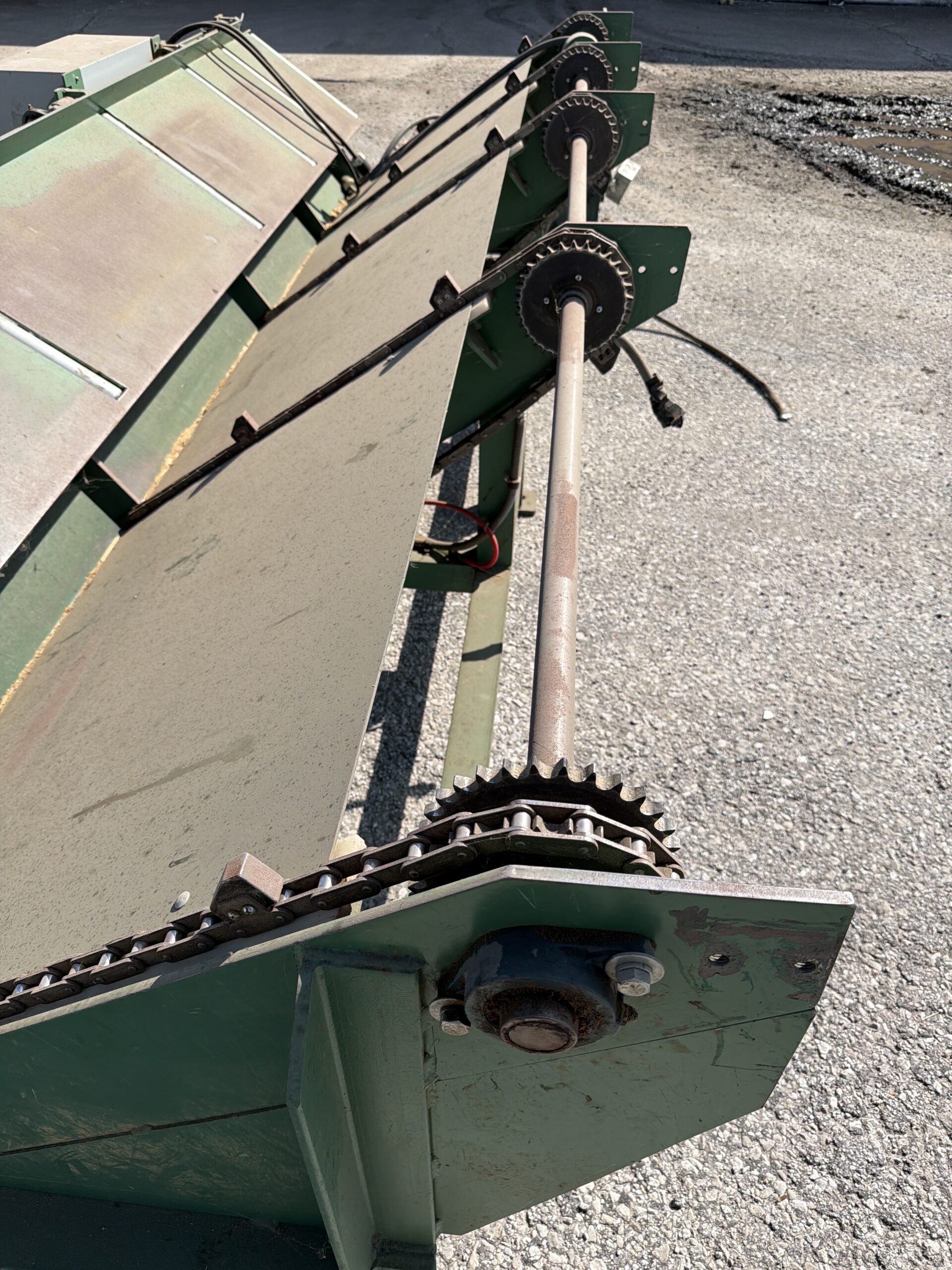 The roller deck raises up when the ripped boards are coming out of the handgrip saw, once the board passes a sensor it will drop the boards and allow the incline chain to pull them up and move them to a green chain. Electrical work required to function with a gangrip saw. 13’ long, 6’ wide. Roller deck is 34” from floor when raised up, chain is 36” from floor.
