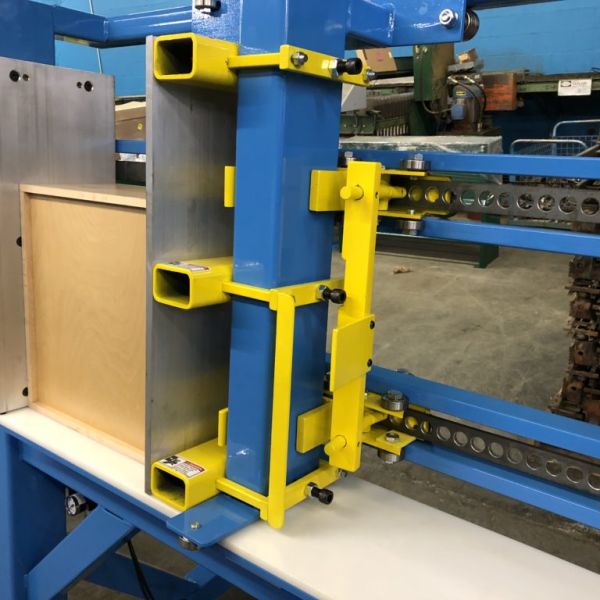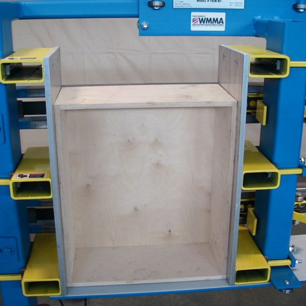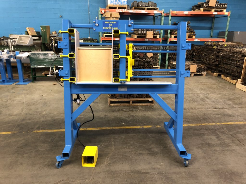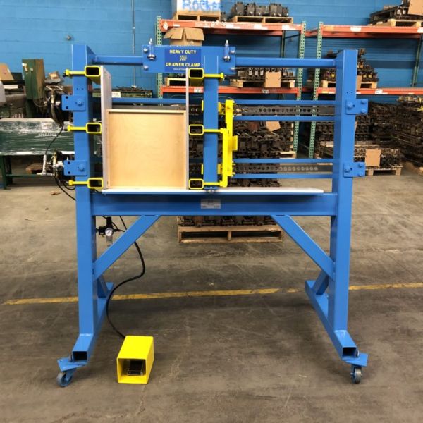 The JLT Heavy Duty Drawer Clamp is Designed to Clamp and Square all Doweled and Dovetail Drawer Construction Types. Our Design is Heavy Duty, Sturdy, Intuitive to Use, and Built to Last. It has Precise Squaring Capabilities with ample Clamping Pressure for your Boxes. A Quick Adjusting Roller Carriage Eliminated Setup Times when moving from Size to Size, and our Fast Acting Pneumatic System will Clamp and Square the Drawer in (2) Seconds. •(2) Standard Machine Frames: 10″ x 24″ x 36″ Maximum Capacity and 12″ x 24″ x 48″ Maximum Capacity