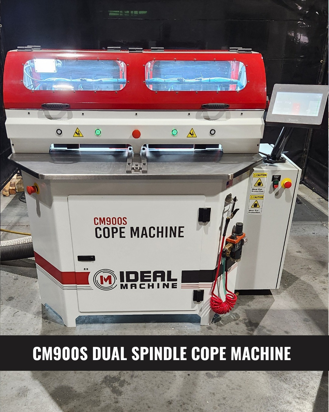 The CM900S’s short cycle time allows you to efficiently move through parts production. You can also load multiple parts in both stations of the machine increasing your parts processing even more. Contact us today for a price on a CM900S cope machine.