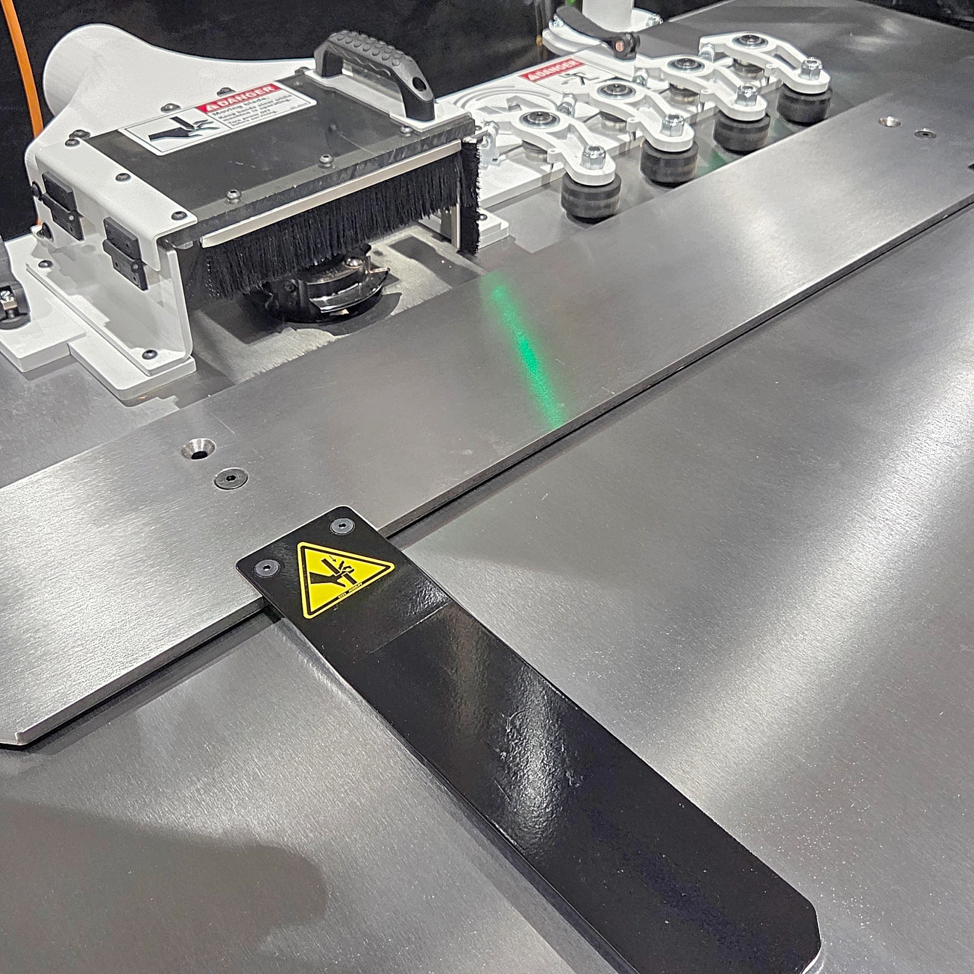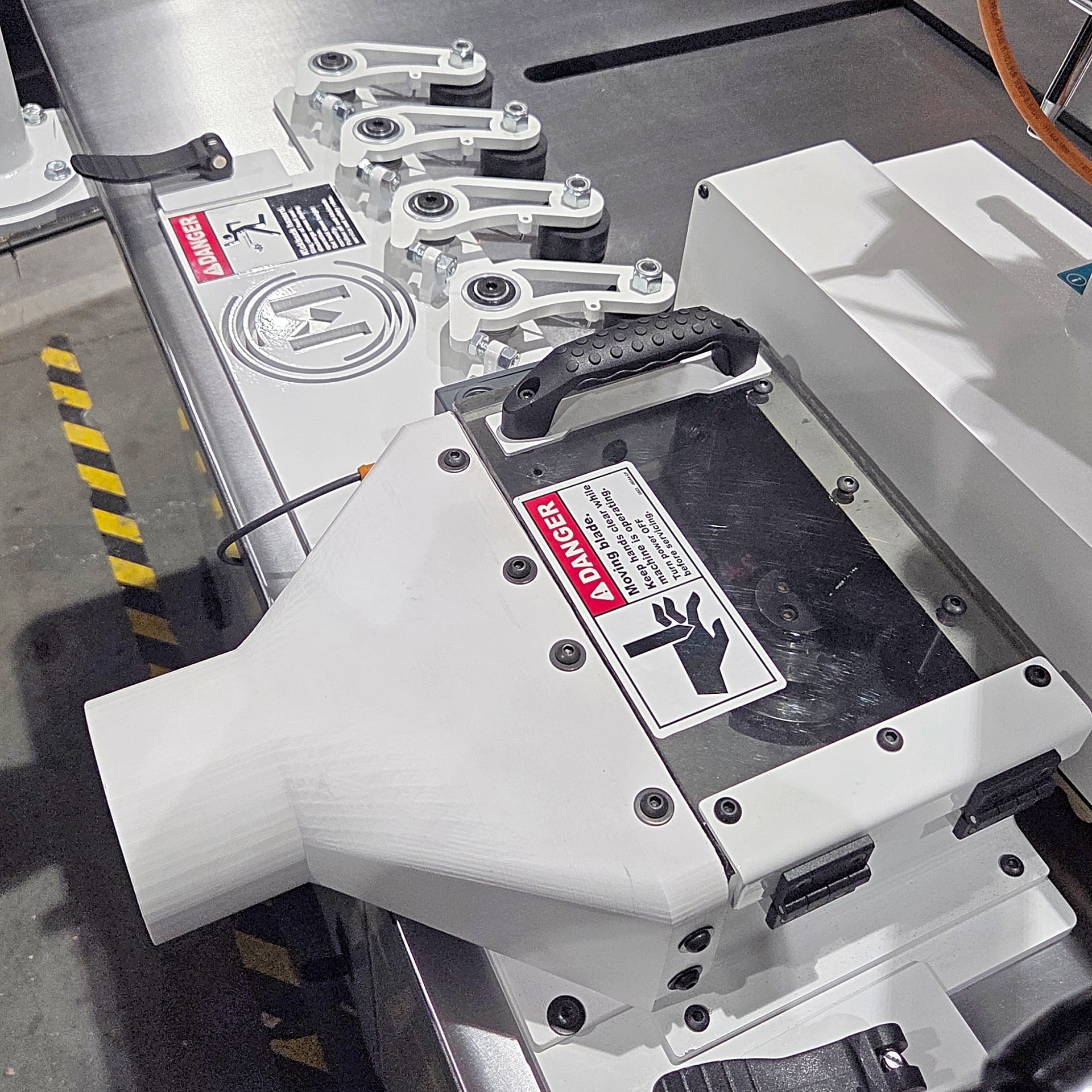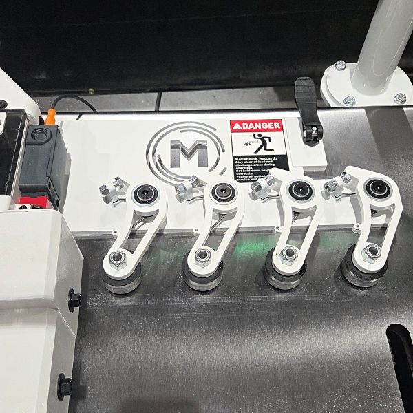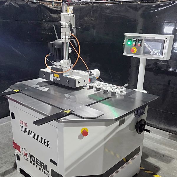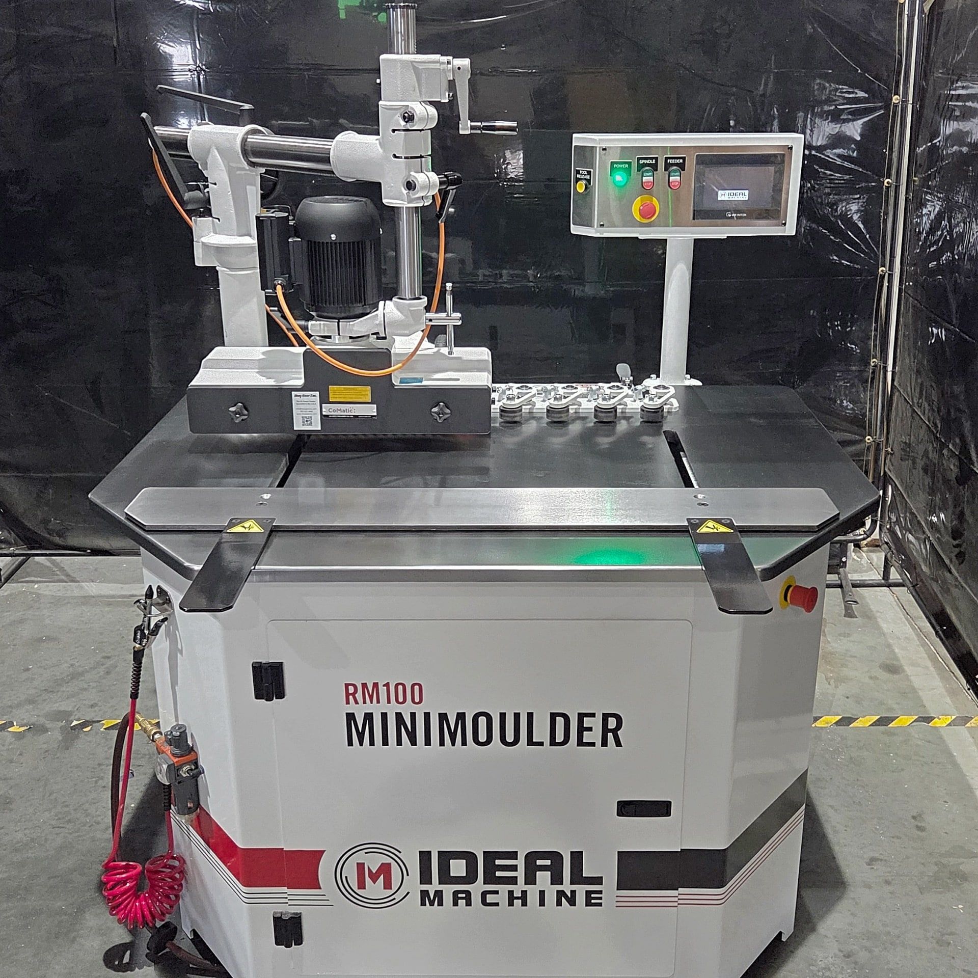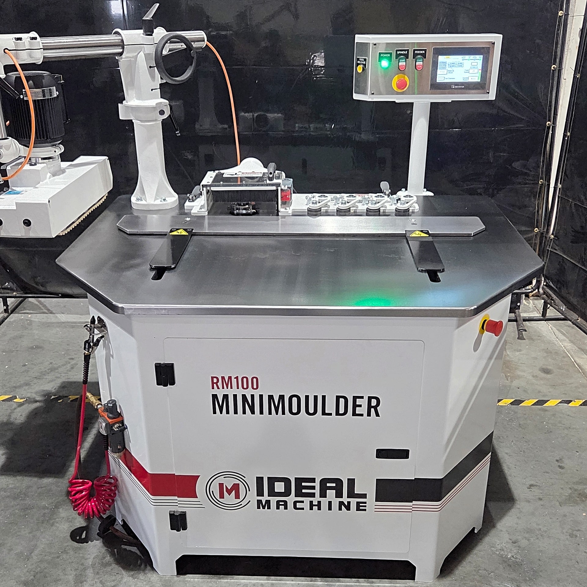 This is the RM100-XL. It is the same as the standard RM100 MiniMoulder except this version features an expanded table top for shaping wider parts and the hopper feed has been removed. With this large industrial wood shaper, you can run wider material up to 18″ wide and material as narrow as 1 1/2″ wide.