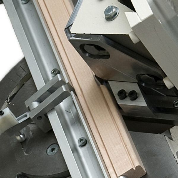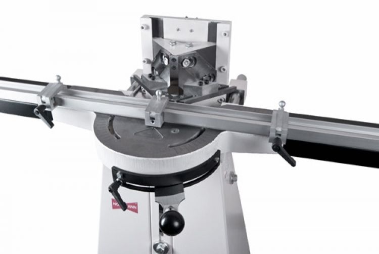 The MORSO NM notching machine is manually operated, light-duty notching machine for the production of beaded face-frames, French-mitered cabinet doors as well as muntin and mullion joints. While this is smallest MORSO notching machine available, the manual operation of the machine, the shape of the cutting head and the MORSO length stop fences are based on the larger NFL and NFXL models. The main differences between the MORSO NM notching machine and the larger, heavy-duty MORSO NFL and MORSO NFXL notching machines are a smaller base frame and reduced footprint, lower table height, sheet-metal extension tables in place of cast-iron tables, overall lighter construction and smaller cutting head and knives. The center table is borrowed from a MORSO guillotine-style moulding chopper and the center stop is a flip-stop design.The vertical travel of the cutting head (and thus the resting position of the foot pedal) can be adjusted depending on workpiece thickness, assuring comfortable operation.