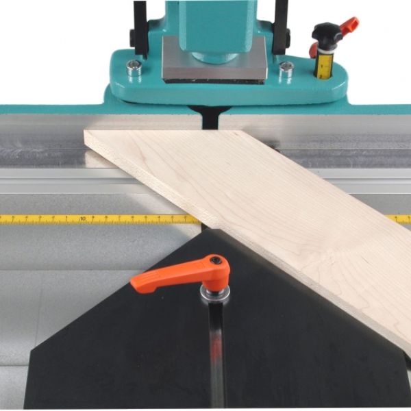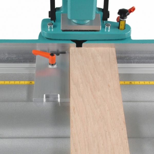 The keyway location is adjusted by positioning the guided center fence plate on the machine table; the keyway length (routing height) is adjusted by setting a height-stop rod to the desired setting.Pulling the main lever downward starts the machining cycle: