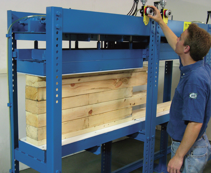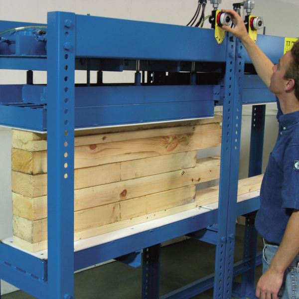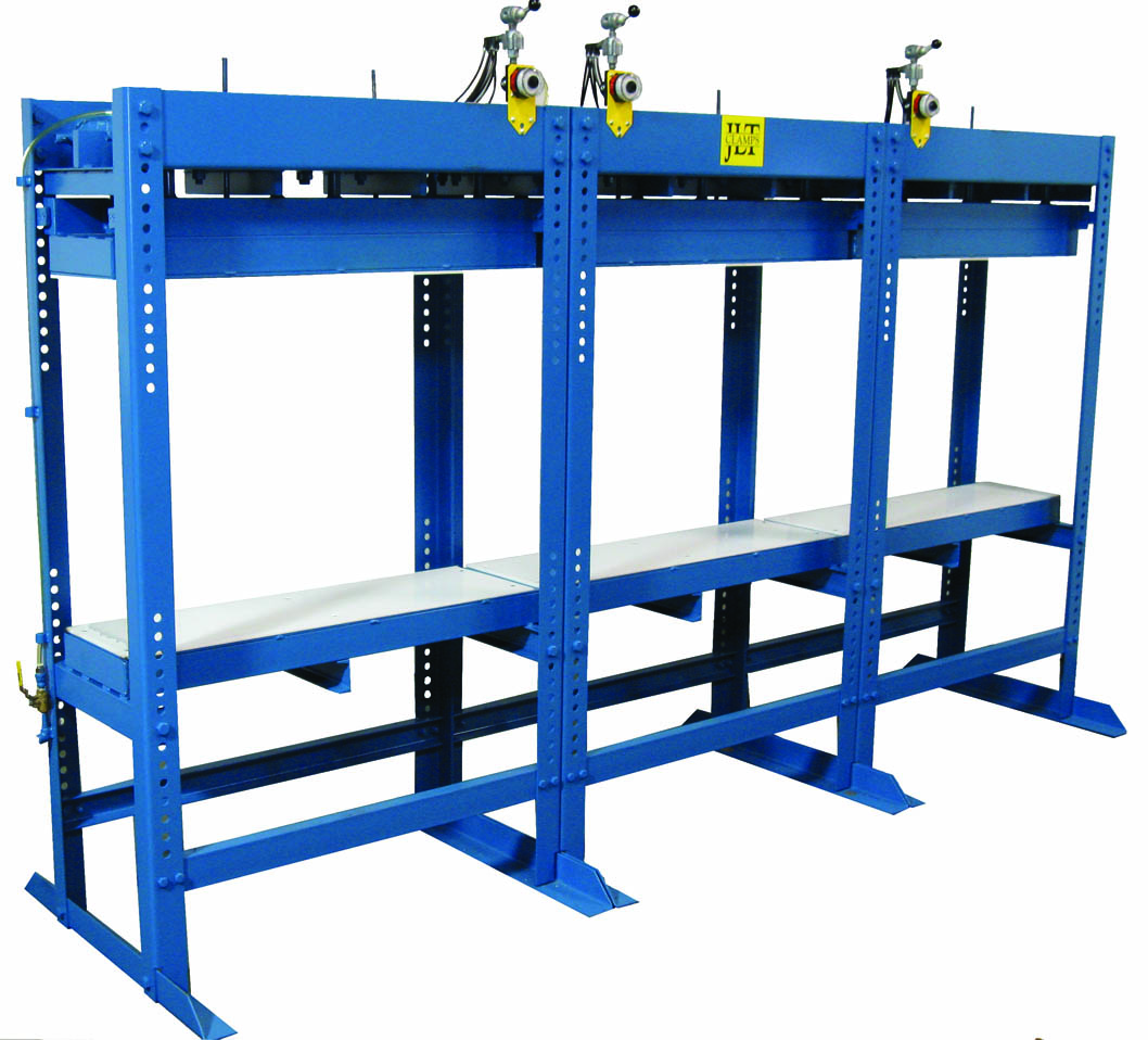The Mini Pod Press is a low cost high pressure cold press laminating machine. It features individually controlled top platens and a bottom platen adjustable at 1 1/2″ increments to a maximum opening of 40″. The work area is 12″ wide and machines are currently offered in lengths of 3-1/2′, 7′ or 10-1/2′. Air pressure and alignment are carefully controlled via dial regulators on each individual platen and air can be locked in for any length of time through the use of a hand operated level valve. Machine Footprint (10′ Long Model): 128”L x 36”W x 76”H