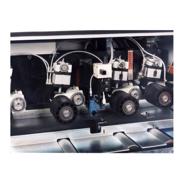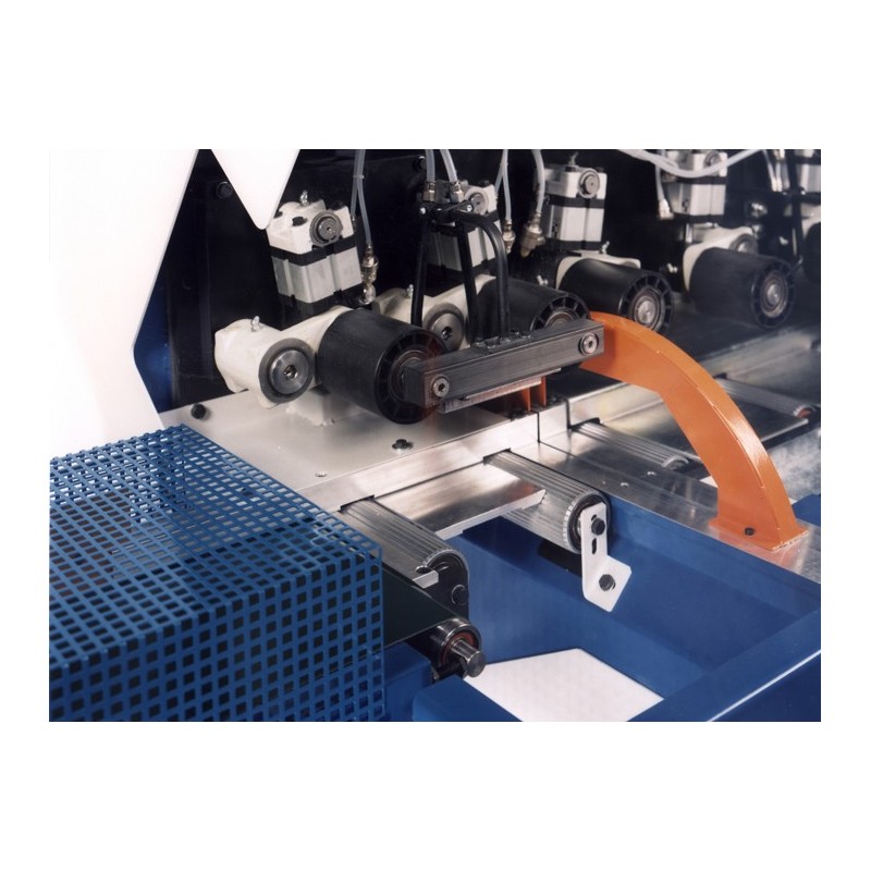 Last Generation automatic programmable cut-off saw for optimized cutting of wood stock and defect removal. Particularly suitable for high production requirements given its very high maximum feed speed of 800 FPM. The set of 11 top pressure rollers are able to compensate for dimensional variations of rough mill stock. The machine is equipped with a PC based computer capable of performing eleven work cycle programs. The numerical control is able to store cutting lists with lengths divided in several different grades and the relevant quantity of parts. Cutting lists can be input direct from the NC keypad or directly through the network. The onboard PC with 19″ monitor provides the following information: – Stock in cubic feet, required to produce the number of pieces in each list. – Number of pieces produced of each length. – Amount of stock in cubic feet divided into: first, second, third grade and waste – Cubic feet required to produce remaining parts. – Yield as a percentage of the total – Print out of all the above data to a parallel printer (optional). The system can perform simulated cutting to verify the result before processing the wood and allowing the user to decide whether to use the chosen parameters for the required production or change it. The T 2030 NC can cut and handle up to 3 different grades within the same cutting list or 5 grades with optional horizontal camera.