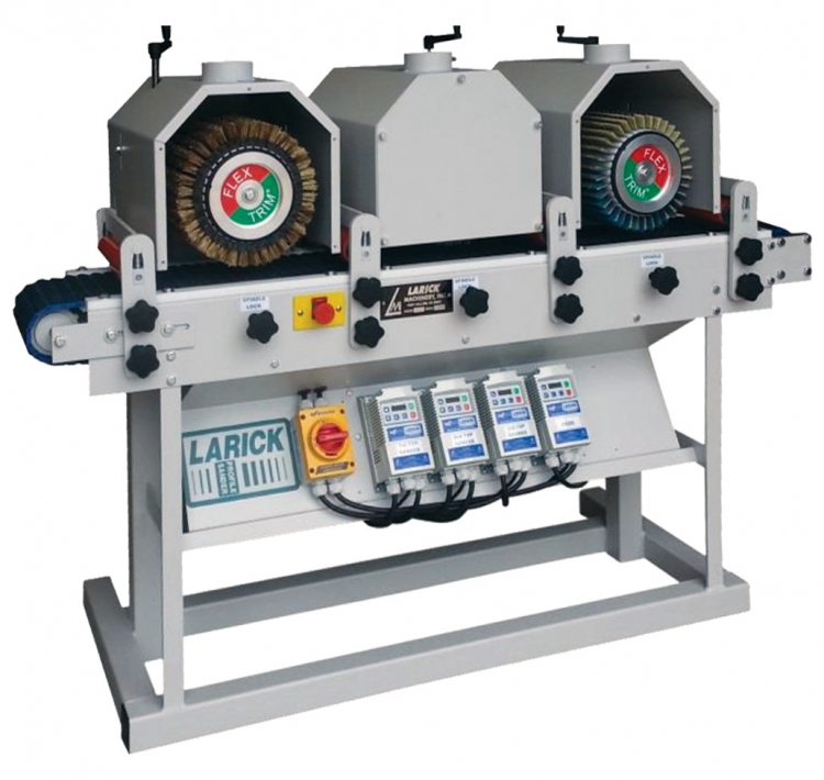 The 700 series sander has a variable speed conveyor under the top sanders. It can be configured with 2, 3, or 4 top sanding spindles, and with or without universal side sanding stations. The conveyor can be either 9 or 15 inches wide. Brush type sanding wheels, wire brushes, or inflatable drums can be used.