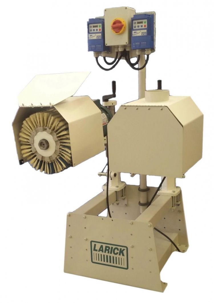 The LARICK 230 Series Profile Sander is a two spindle machine designed for use with flexible brush type sanding wheels. The spindles adjust individually, with vertical, horizontal, tilt and rotation. It can be placed at the outfeed end of a moulder, over a table, or used to sand free-hand. The spindle motors are controlled by inverters giving individual variable speed and sanding direction. The spindles on the Larick Model 230 adjust individually to sand the top, bottom, front, or back of parts. In addition to the built in adjustment of the stands, the stands may slide forward/back on the base in addition to mounting the base higher or lower. Locking casters allow it to be rolled into postion and locked in place. Inverters control the spindles’ speed and rotational direction individually.