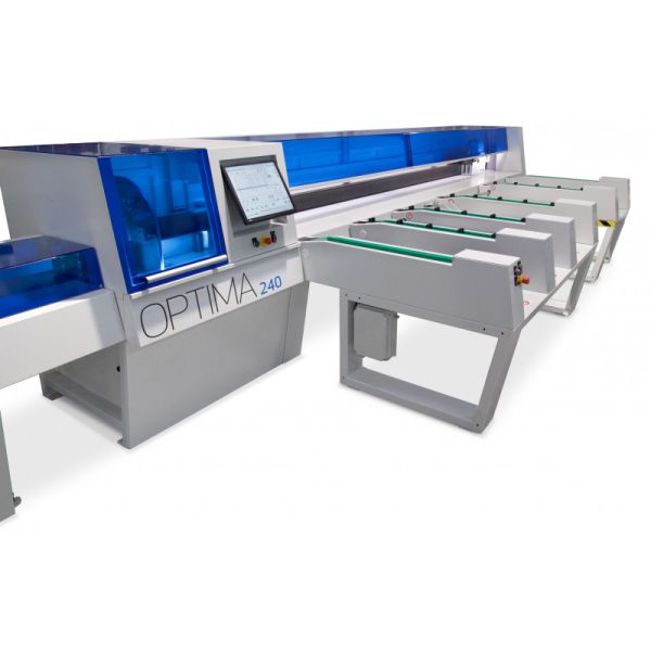 The OPTIMA 240 is a Push-Feed Optimizing and Defecting Cut- Off Saw, for high speed production. The last generation CNC, with Windows Embedded OS and connected to an adjustable 19″ Touch Screen display, combines reliability, ease of use and always maintains the ergonomic position of the operator. The network connection is guaranteed by an available RJ45 Ethernet port and the software allows for reports on the ongoing production runs, to always be available on screen or through the network, without interrupting the process of the machine. The pusher system, rides on precision linear rails and bearings and, along with the pneumatic tail clamp and linear encoder, ensures very accurate positioning of the work piece (+/- 0.15 mm). The loading table, allows the operator to grade and prepare multiple boards which may be loaded in sequence, eliminating waste of time. The cutting area is fitted with a system of “intelligent” vertical and horizontal clamps, which automatically adapt to the dimension of the stock being processed, making the cutting cycle faster and ensuring the squareness of the cut pieces. The optimization software features a wide variety of available cutting programs and combinations, which make this system very versatile and ready to respond to the different needs of the industry. The OPTIMA 240 is available in 2 different configurations of maximum length of infeed boards, 4200 mm and 6200 mm. The system may be completed with a variety of optional equipment such as sorters with kickers, automatic loading systems, in-line high resolution ink-jet printer width sensor as well as custom executions, based on the needs of our customers.