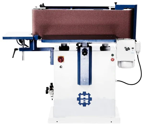 The R 300 is primarily used for workpieces with heights of up to 300 mm. The sanding unit with a height of 300 mm oscillates appr. 30 mm, hereby contributing to a long service life and high surface quality. A pneumatic belt tensioner enables a quickly and easy change oft he sanding belt and ensures good belt tracking. The stable height adjustment mechanism for the working table ensures a high-precision sanding result even for heavy and tall workpieces. The R 300 is also available in other dimensions. Additional table on the pulley.