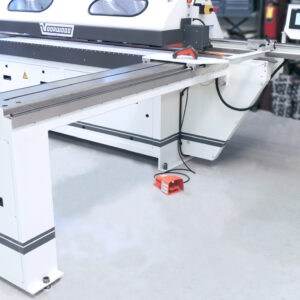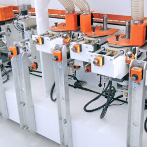 The A117 Shaper Sander transport system incorporates a bottom transport chain assembly and a roller hold-down assembly. The transport chain assembly is composed of a urethane top with double V-lug that traveling over a precision-machined double V-track, which guarantees precise linear transition of the part through the machine. The single-end tenoner is equipped with a dual purpose edge guide system, which accurately squares the part as it is fed to the shapers. It provides adjustment for straight and arch pre-cut boards.