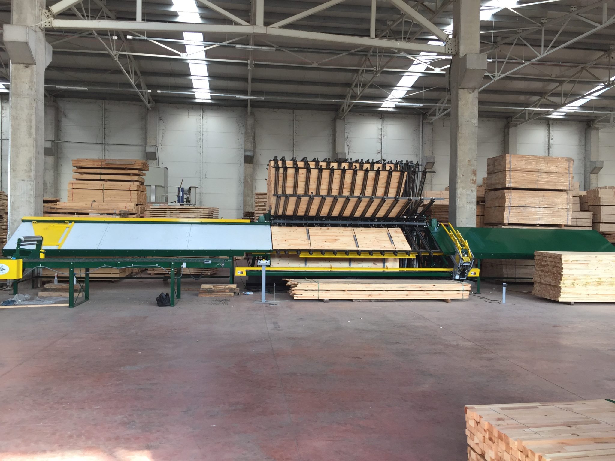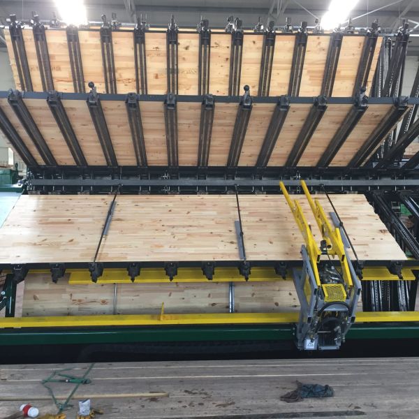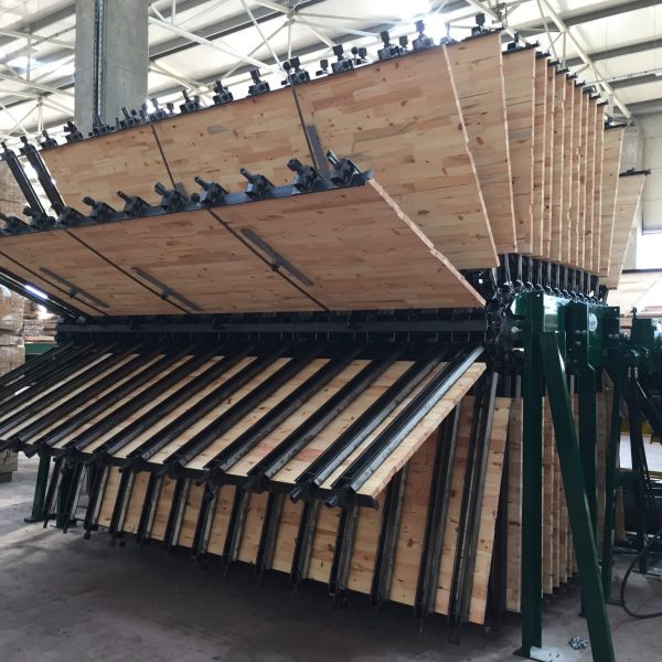 The Side Loading Automated Clamp Carrier is a standard model in our Automated Clamp Carrier line. The system includes all the productivity and design features of our Automated Clamp Carrier. However, it is equipped with a side loading infeed table and application system. This design is especially effective when edge gluing or laminating long material. Productivity levels are higher than the standard Automated Clamp Carrier because panels are being laid up on the infeed table at the same time that the previous panel is being tightened and flattened. In addition, large panels are pushed out of the machine onto a table or conveyor. This eliminates heavy lifting.