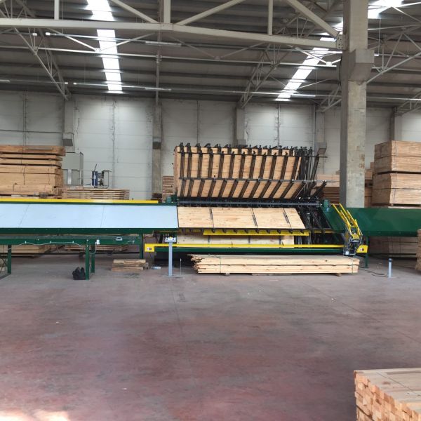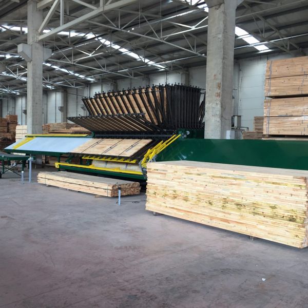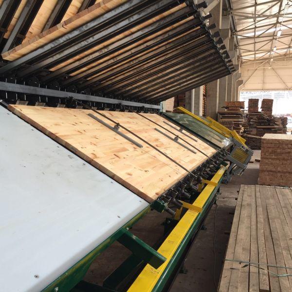 Taylor automated machine for gluing & laminating long material. The continuous flow operation works well with both edge glued and face glued long components in a high production environment.
