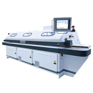 When the substrate is loaded against the precision edge guide, using sensors, the width of the board is automatically measured. As the material is being fed into the machine, contour designs can be automatically scaled to match the width of the substrate.