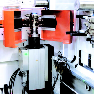 The A1517 Single-End Tenoner can accommodate five or more stations with identical HSK-63F spindle motors, to be used in any configuration of shaping and sanding. All spindles are reversing and set up to rotate with or against the direction of feed with a jump feature on the first station. The stations can be horizontally locked for straight shape/sand or CNC controlled to shape/sand pre-programmed contours (arches). Auto-positioning which includes automatic CNC control of the edge guide, hold-down, and the horizontal and vertical axis for all shaping and sanding stations for best repeatability possible. Servo positioning is accurate within.002”. The transport system incorporates two bottom transport chain assemblies and a combination roller and belt hold-down assembly. The transport chain assembly is composed of a urethane top, double V-lug, traveling in a precision-machined double V-track, guaranteeing precise linear transition of the part through the machine. The belt hold-down consists of a non-marking urethane belt backed by a roller chain that provides the hold-down pressure at every 0.5”. This allows the machine to take very large contour cuts while hanging on to a very small area. This technology makes the Voorwood transport system the most secure and accurate in the industry.