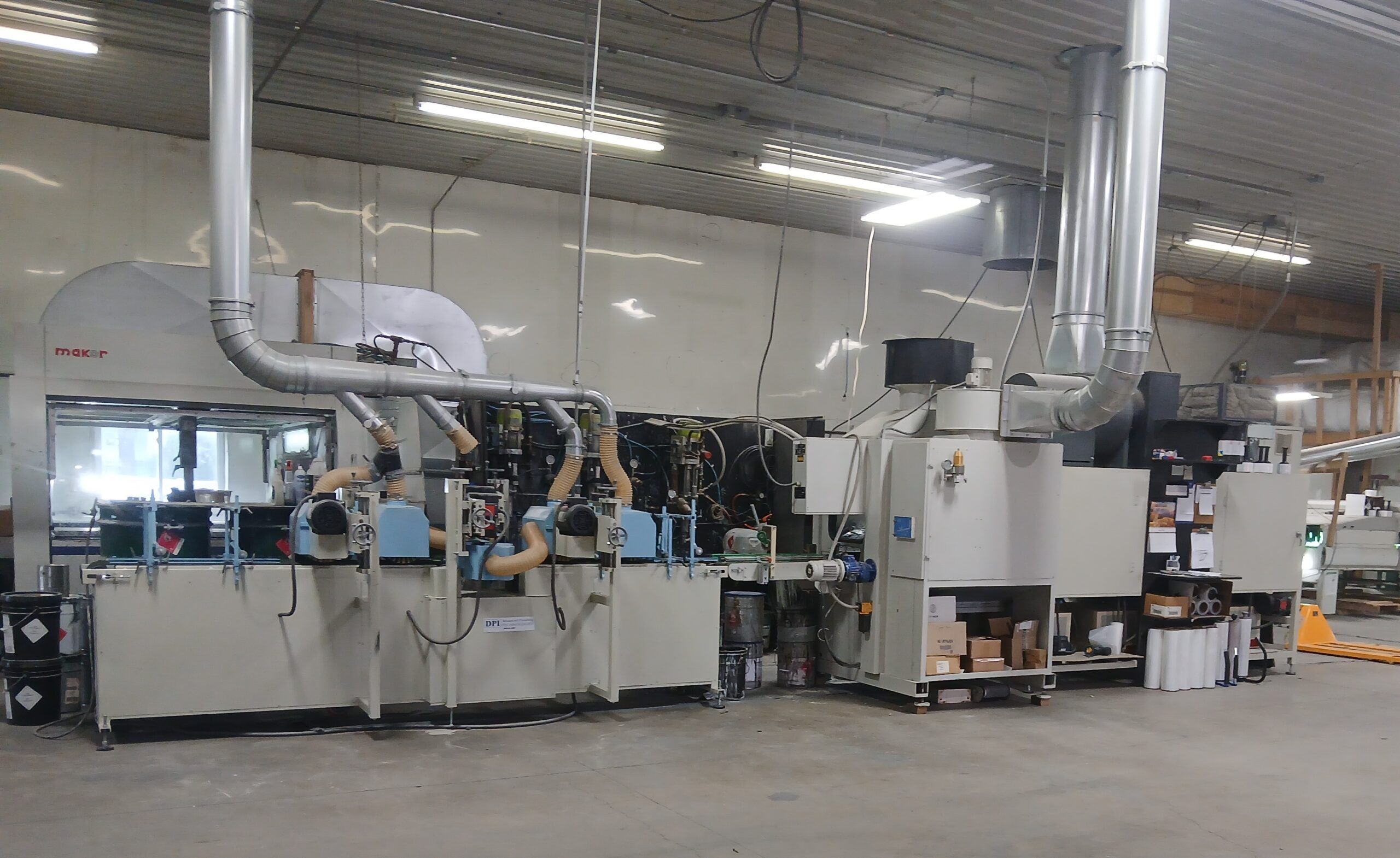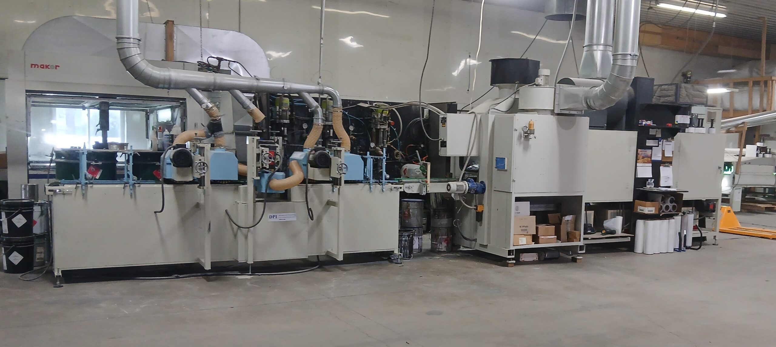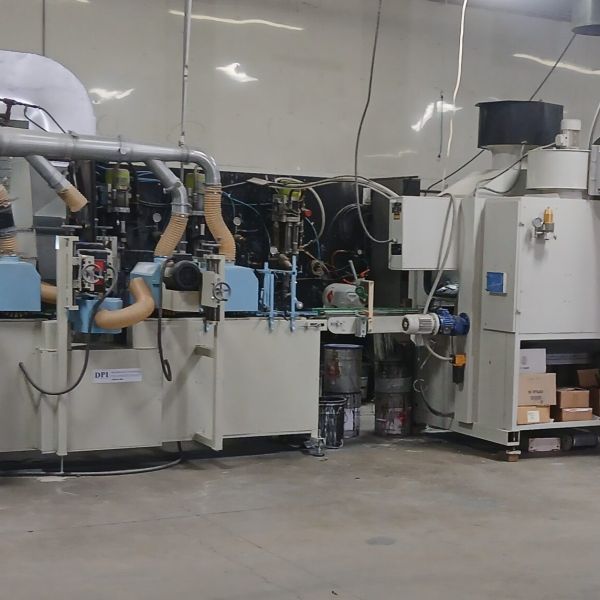 FINISH/SPRAY LINE DELLE-VEDOVE LINIAL SPRAY MACHINE. CAPABLE OF SPRAYING ALL 4 SIDES AT ONCE. INCLUDES GRACO MONARCH PUMP AND 4 KREMLIN AVX GUNS. ALSO INCLUDES DENIBBING SANDER MODEL SLC10 AND LIGHTS. SANDER AND LIGHTS ARE BRAND NEW SPRAY LINE IS USED.