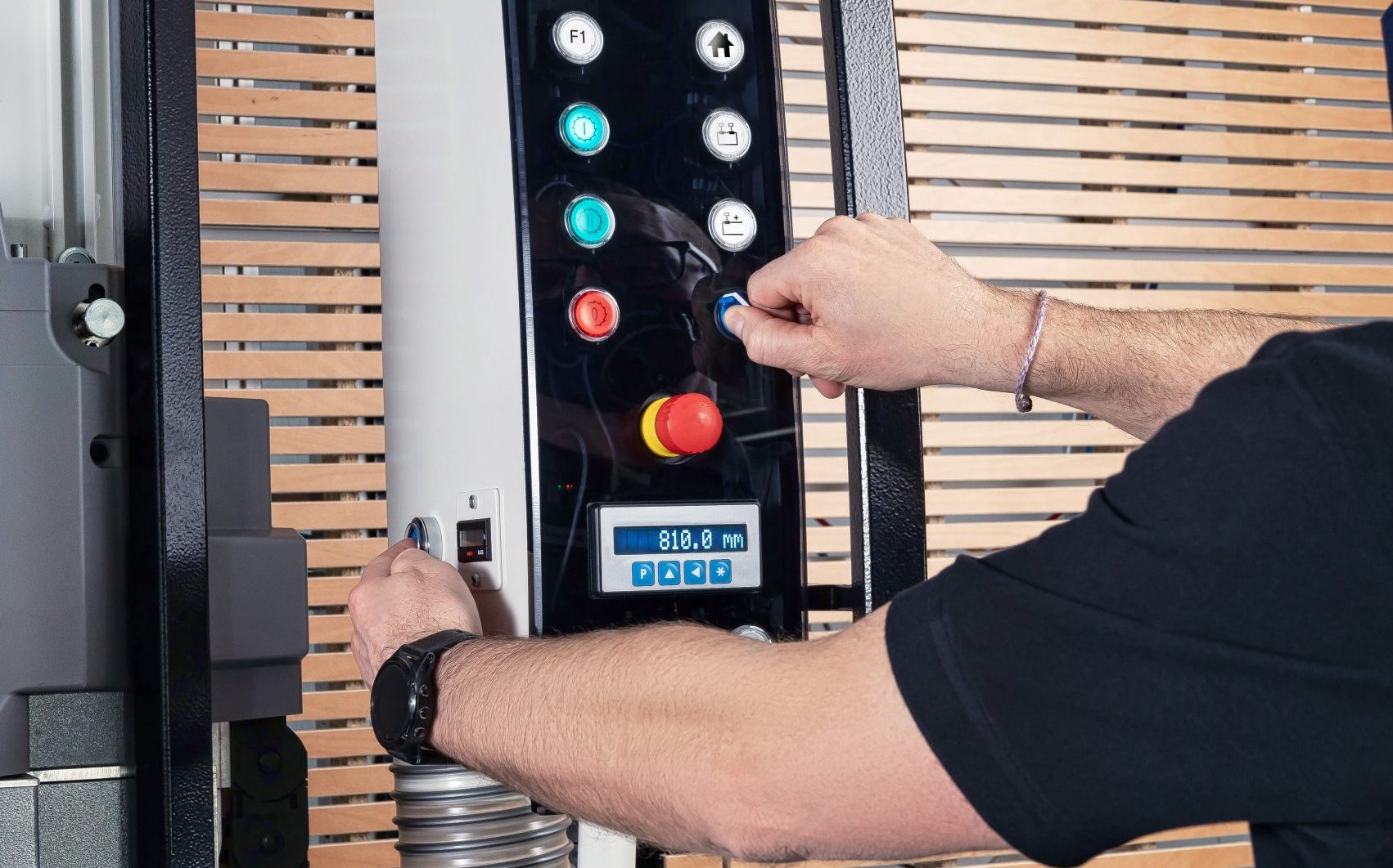 • Two panel lifters on right side of saw to suspend multiple panels up to 7’ x 10’ x 60mm (2-3/8”) thick and up to 350 lbs.; allows strips to be cut and processed from bottom of panel with no need to flip panel! Two-handed control assures safety in use. Third lifter available (see below).